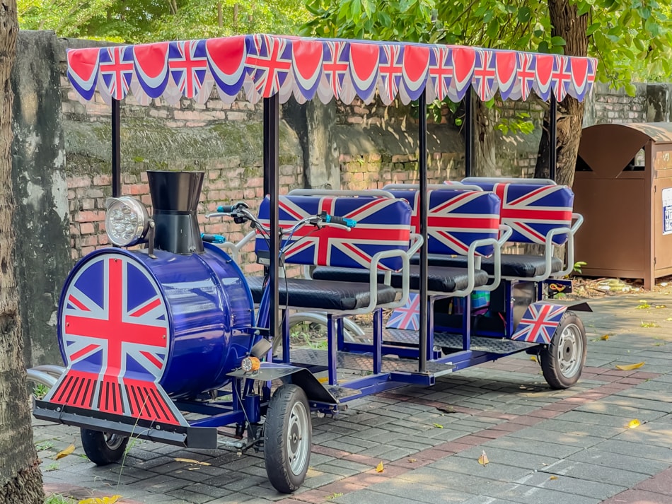 ▲另一款兩大兩小的,像我們兩大一小,其實坐兩人的就可以,但女兒堅持要坐兩大兩小款的比較帥氣,因為有小朋友專用的方向盤。(照片來源:新宇自行車出租粉絲團),我記得四人座的還有一款火車頭造型的。