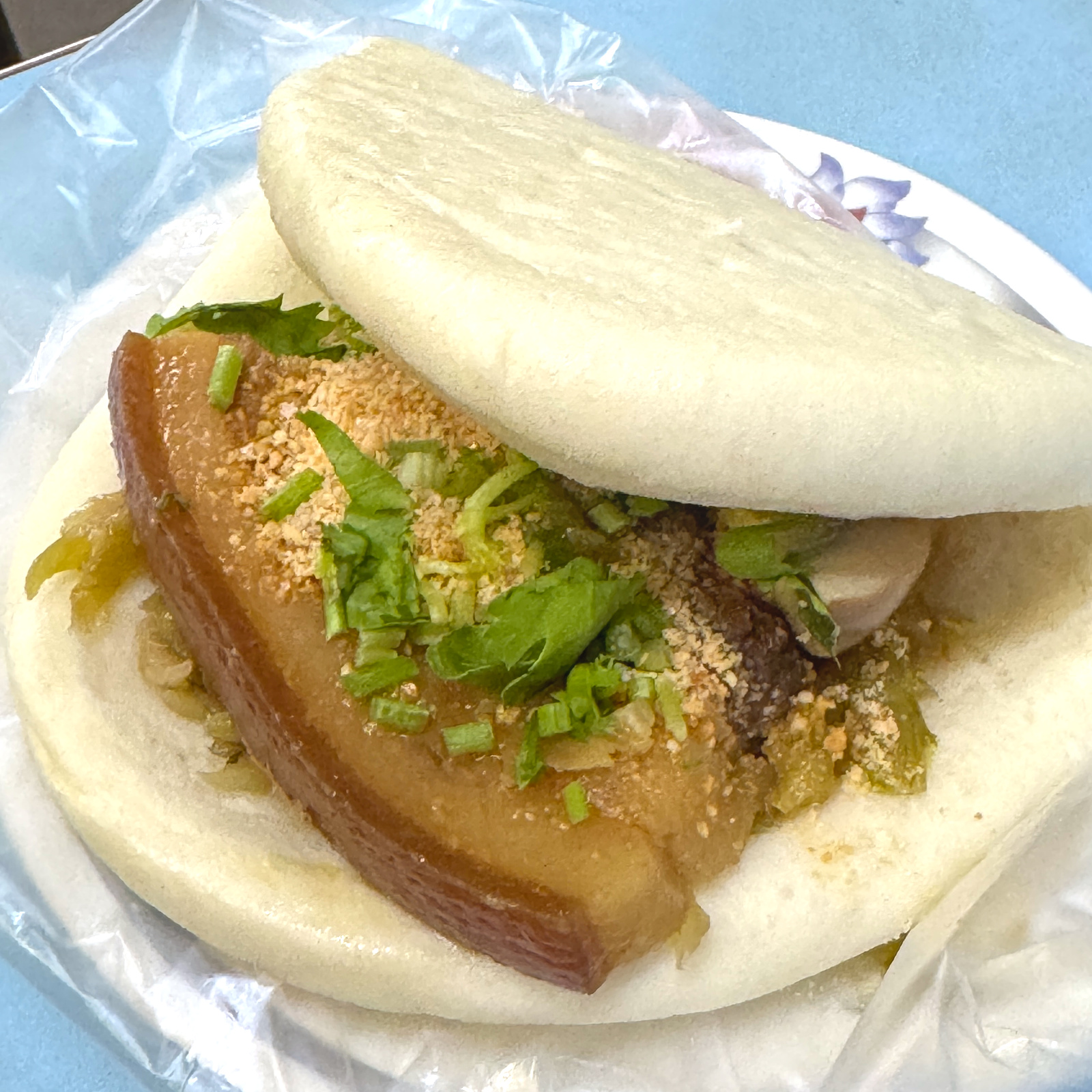 雖然是麵店,但我最愛的是刈包,鬆軟的白色外皮,還有一些嚼勁和天然發酵的香氣,夾著一塊滷到晶亮的五花肉,花生粉的香氣與香菜的清新,在口中交織成最樸實的感動。