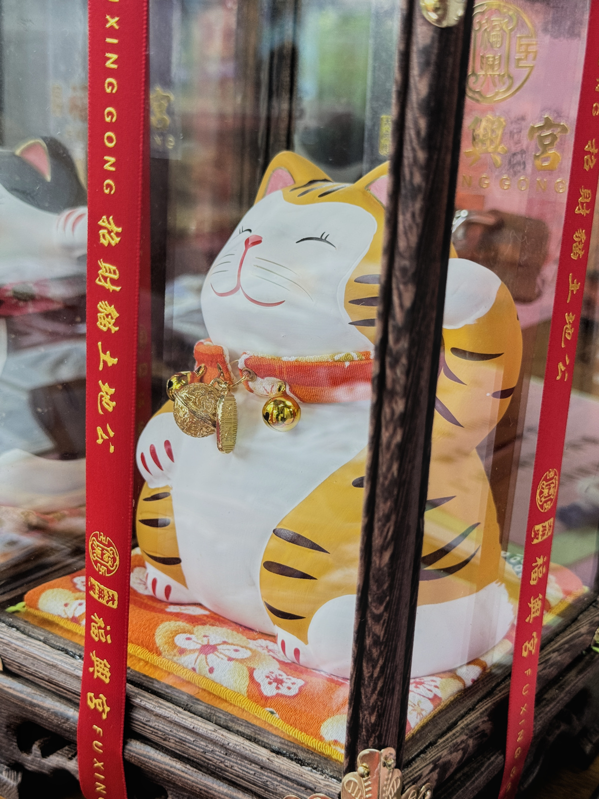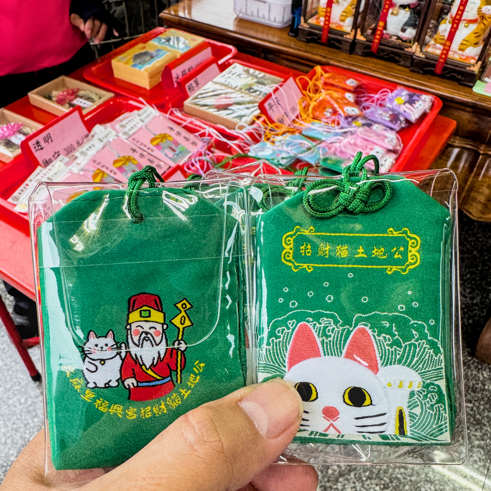 往內走進「福興宮」,原本以為是莊嚴肅穆的土地公廟,沒想到畫風一轉,竟然被滿滿的招財貓元素給包圍!從廟宇旁的巨大招財貓公仔,到土地公公身邊可愛的小貓咪,每一個細節都讓人會心一笑。