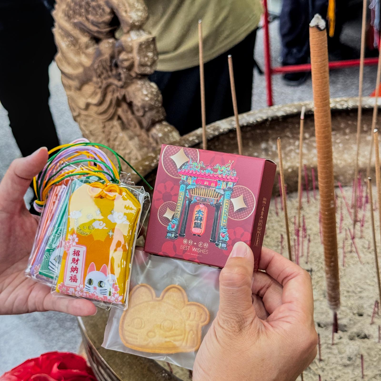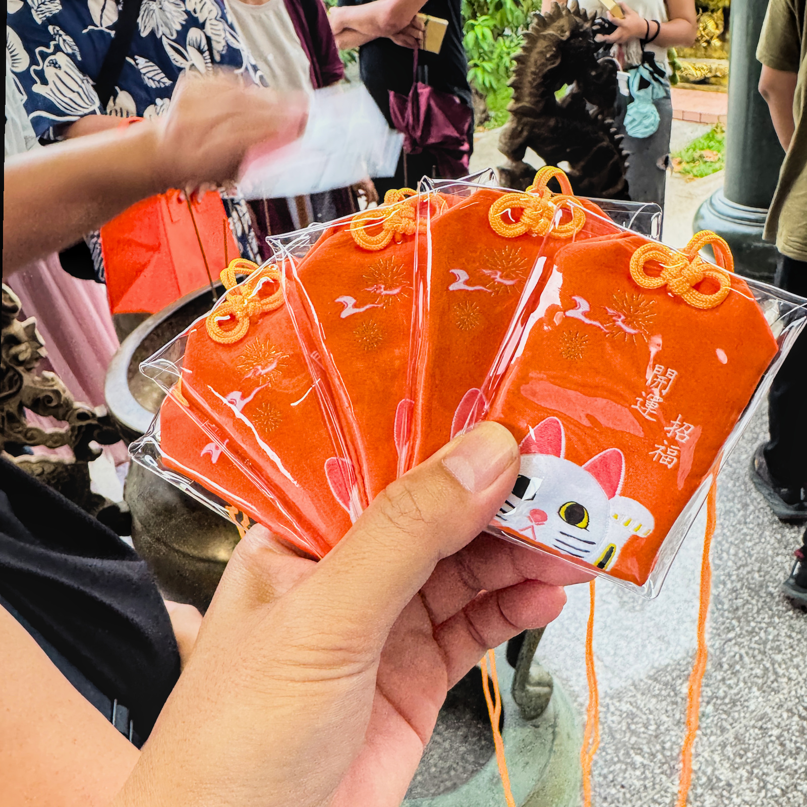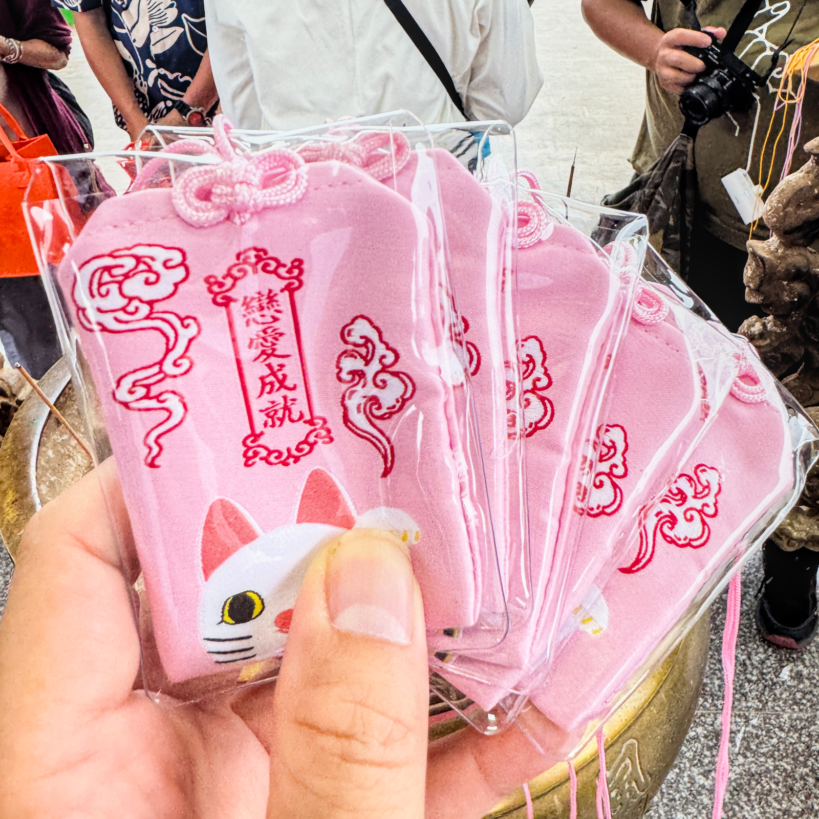 這裡的御守也超級犯規,各種顏色的貓咪造型,保佑健康、財運、戀愛,讓人選擇困難症發作,想全部打包帶走!當然不能錯過這裡限定的貓掌造型平安餅,拜拜完吃一塊,感覺整個人從裡到外都被療癒了。