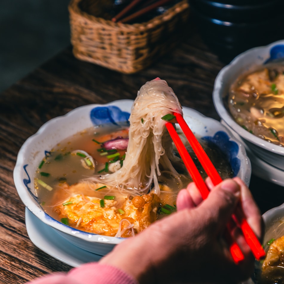 ▲老酒麵線:傳統配方,湯頭濃郁,麵條滑順,每一口都充滿家的溫暖。