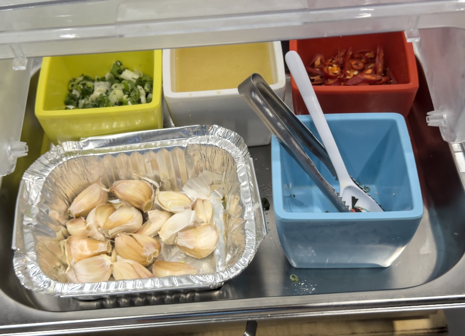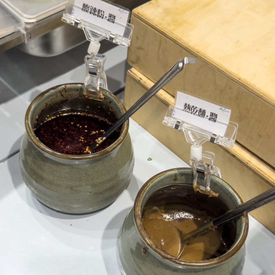 提供兩種麵條,旁邊就是現煮鍋,簡單川燙即食。特製熱乾麵醬與酸辣拌麵醬,搭配蔥花、蒜末、辣椒更夠味。