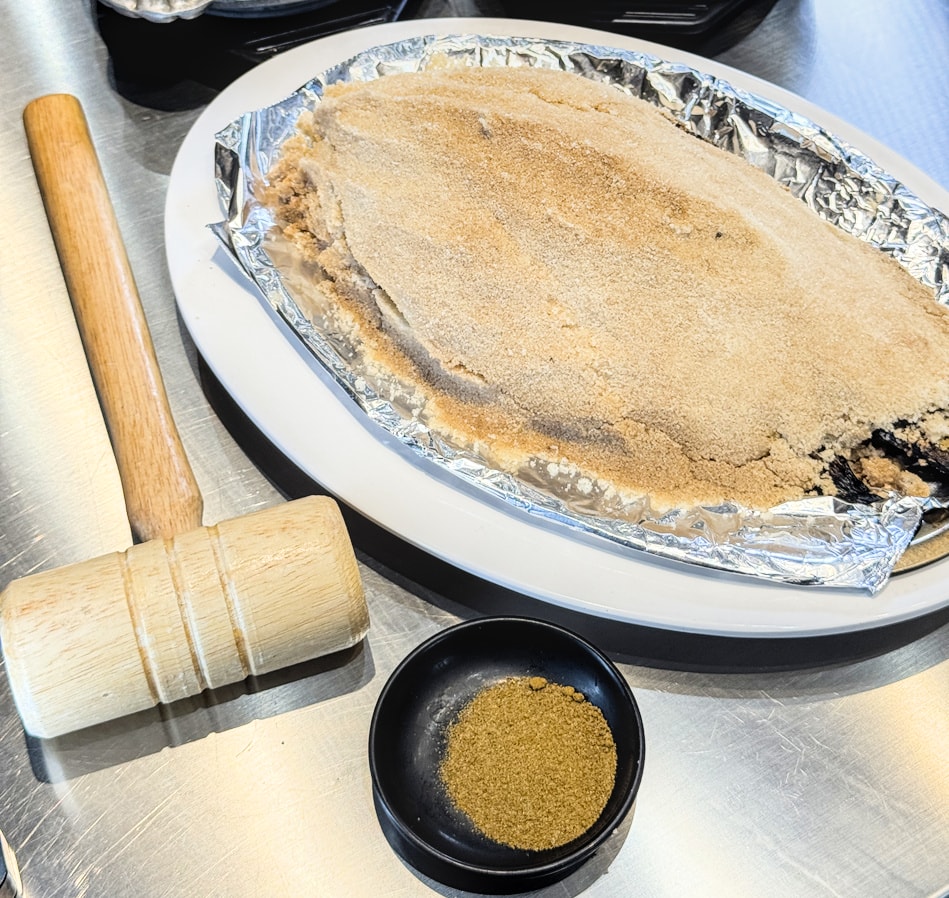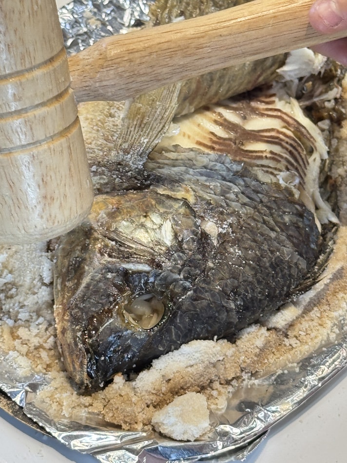 ▲▼霸氣上桌的鹽封烤魚,一整尾用厚實鹽層包裹,高溫焗烤後以木槌敲開,香氣四溢、魚肉嫩口!上桌還附香料粉、木槌及小鍋料理搭配,視覺與味覺雙重震撼!