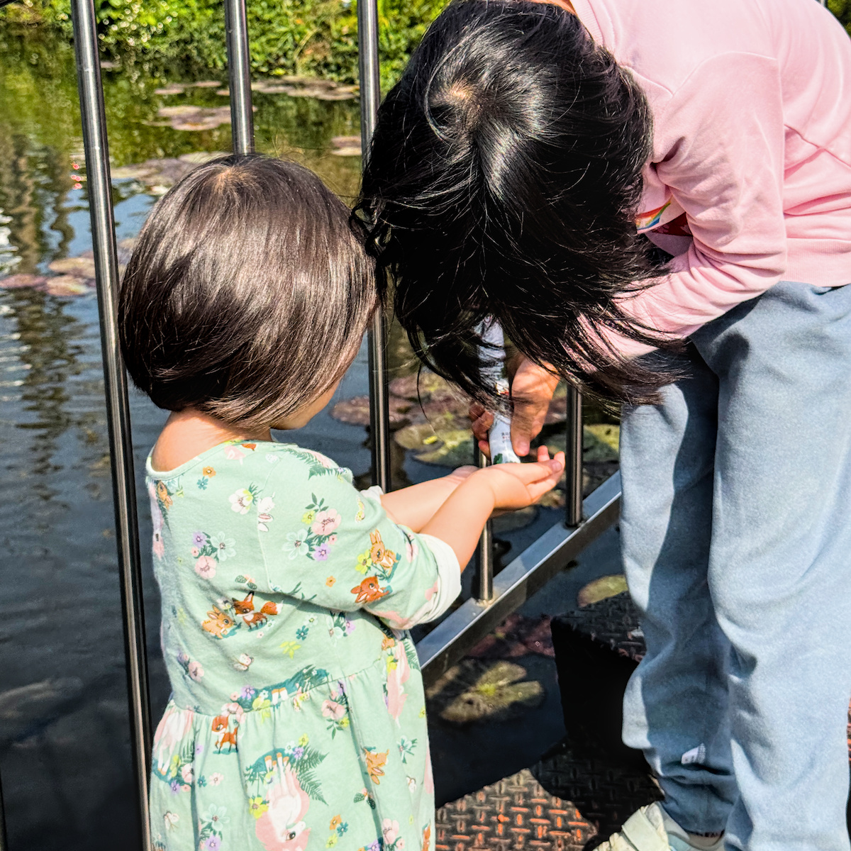 市集裡充滿在地人情味,我們品嚐了手工洗出來的愛玉、現擠果汁,還有外酥內軟的芋粿巧。最後來到翠湖水上餐廳,中午時分坐在涼爽的室內區用餐非常舒適。孩子們吃飽後最期待的就是去湖邊餵魚,看著魚群聚攏,她們玩得興奮不已。這種結合戶外活動、在地小吃與特色餐廳的行程,真的強烈推薦給家庭客!