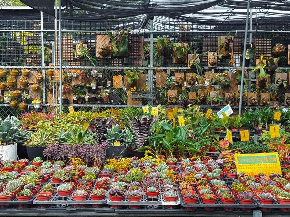 ▲這一區有觀葉植物、蕨類等植物。主要展示了各種觀葉植物。這些植物被整齊地排列在架子上,並且每盆植物前都有一個黃色的標籤,上面寫有植物的名稱和價格。