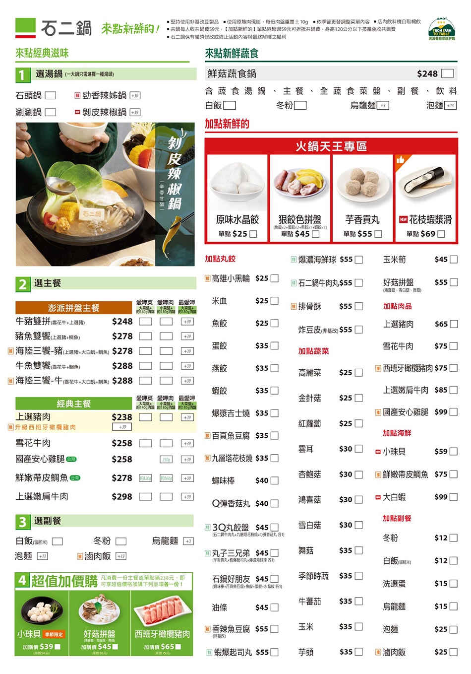 ▲石二鍋提供石頭鍋、涮涮鍋等四種鍋物。可以選擇「愛呷菜」、「愛呷肉」或是加價點「最愛呷」。