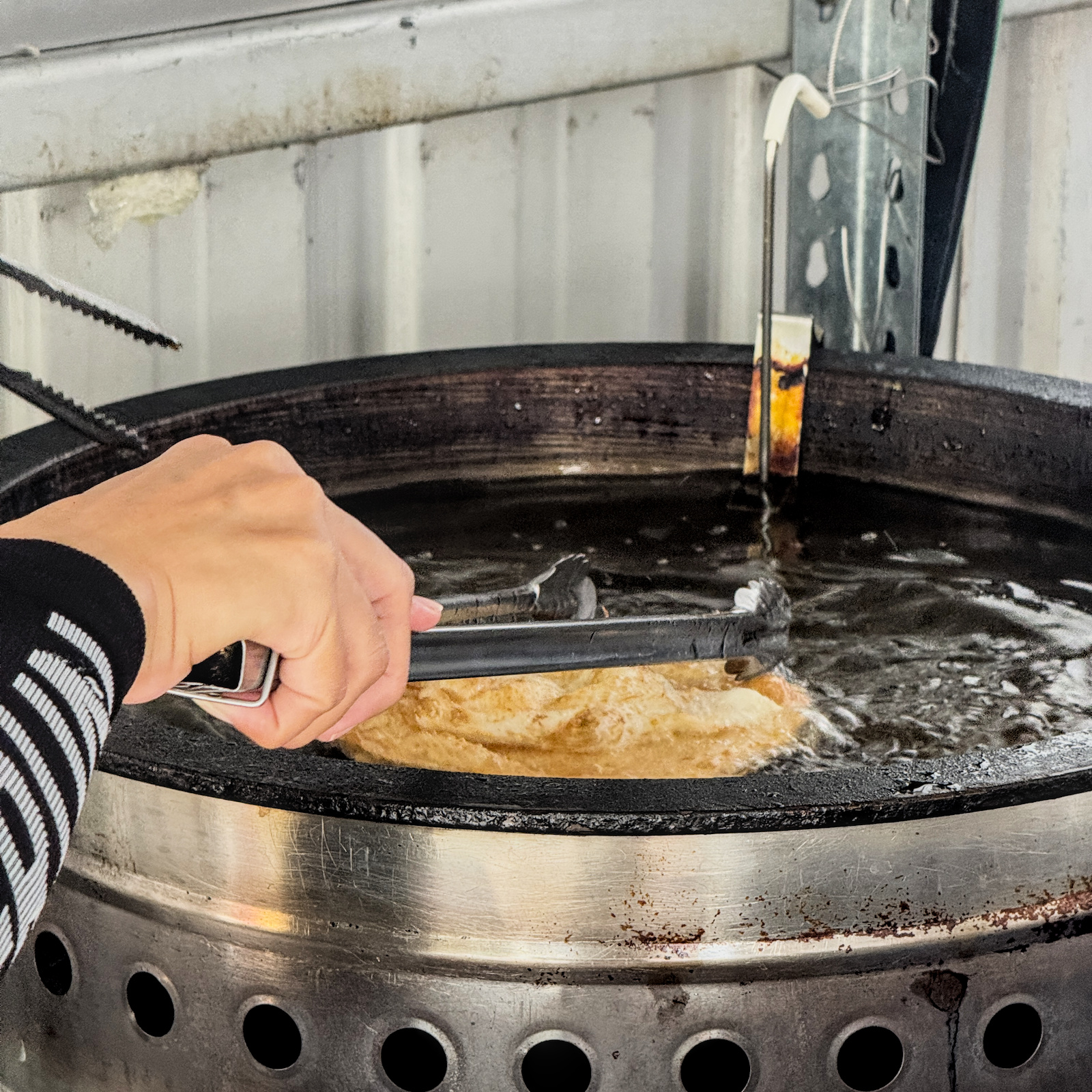 ▲老闆每天都堅持使用新鮮麵糰,現點現桿,確保餅皮的新鮮與彈性。看著麵糰在油鍋中慢慢膨脹,變成金黃飽滿的圓形,這視覺效果就已經讓人食指大動。炸出來的蛋餅外層酥脆無比,帶著討喜的油香,口感澎鬆卻不油膩,咬下去還能聽到喀滋喀滋的酥響。