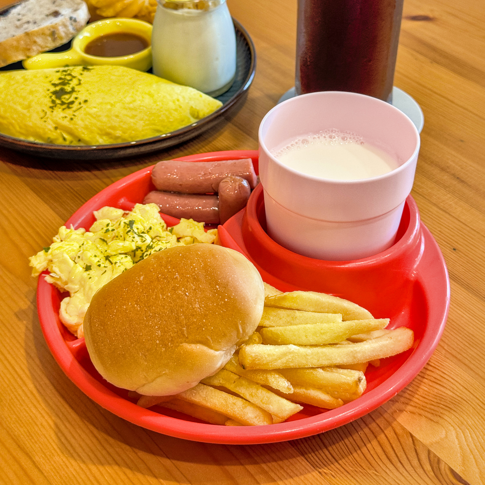▲可愛的分格餐盤,包含炒蛋、麵包、薯條、小熱狗與牛奶,份量剛剛好,小朋友完全不挑食。