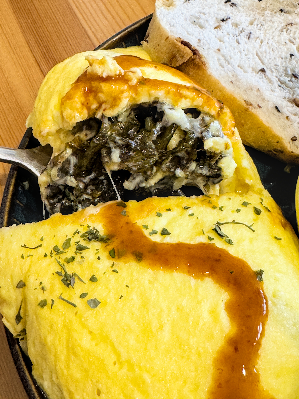 ▲▼外觀蓬鬆、十分漂亮,切開後是滿滿的雨來菇與洋蔥餡料。雨來菇的鮮、洋蔥的甜,加上軟嫩蛋皮,吃起來層次豐富。附上的手作麵包有嚼勁又不搶味,很適合沾著歐姆蕾醬汁一起吃。