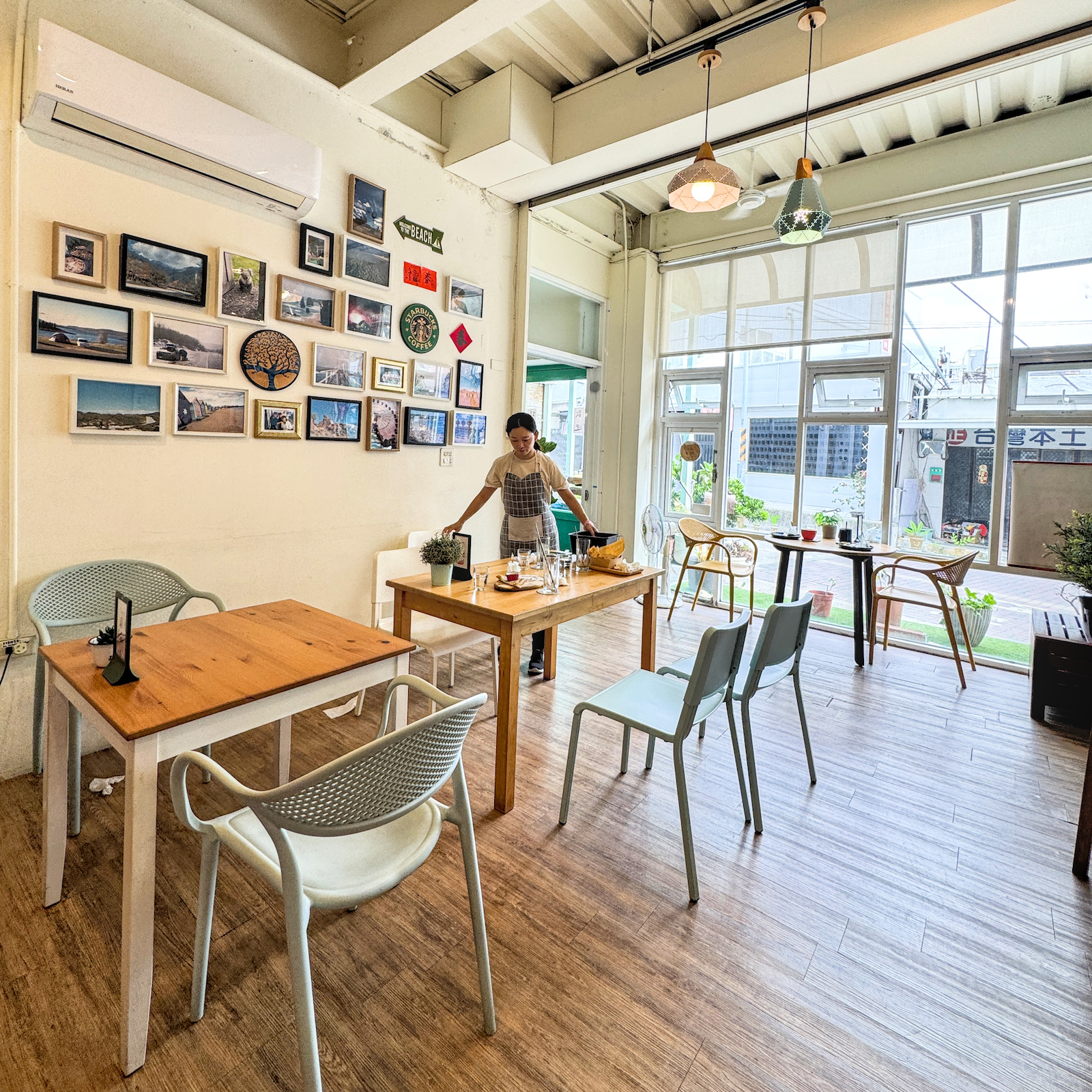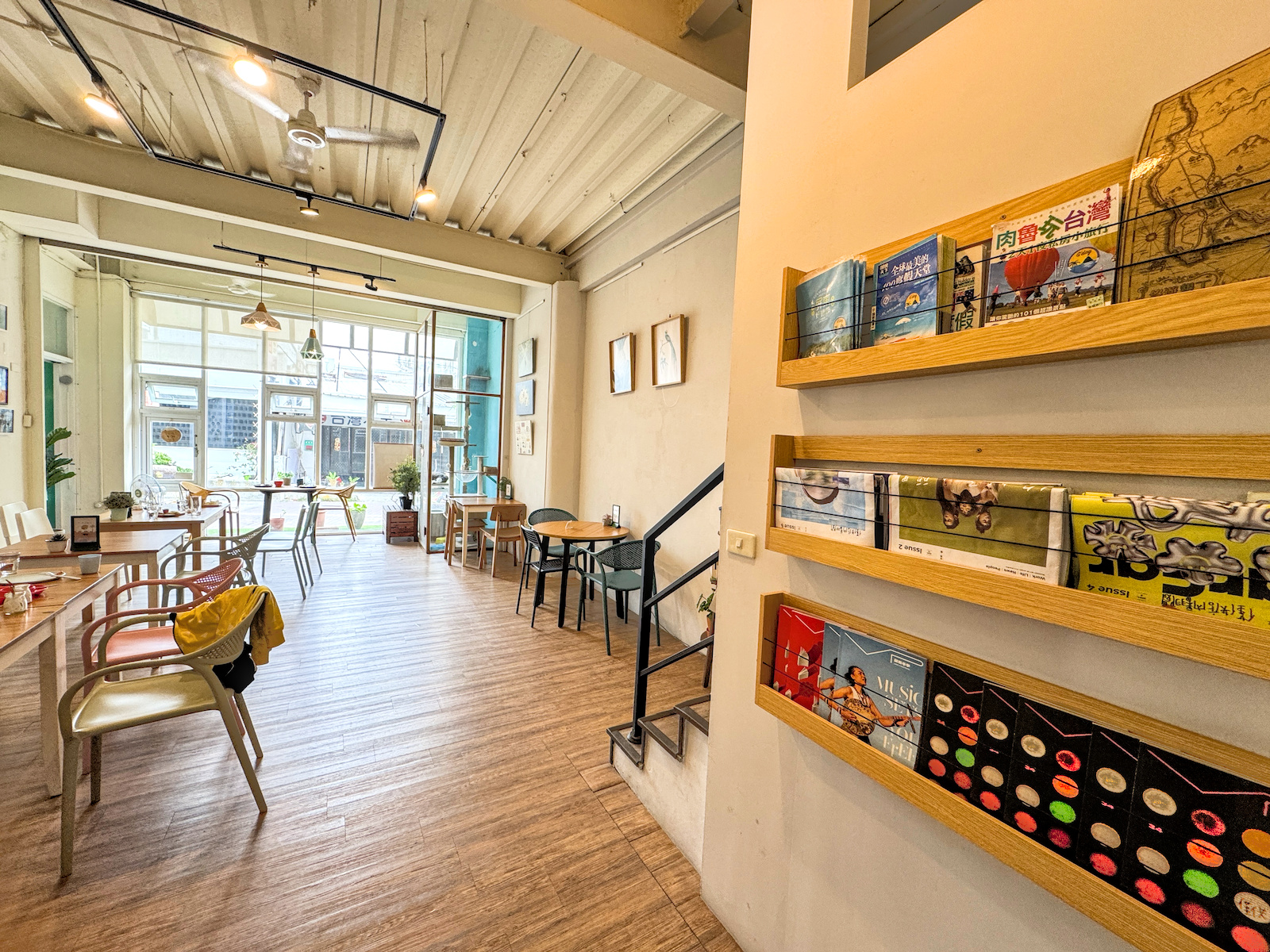 ▲▼外觀以綠色屋簷與木頭元素組成,搭配門口滿滿的植栽,非常有南國慵懶感。推門進入店內,空間明亮寬敞、木質地板搭配多彩座椅,加上牆面上滿滿的旅遊攝影作品,整體氛圍像是進入溫柔的小小旅行基地。