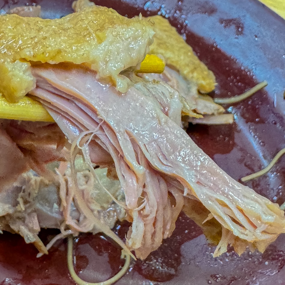 湯色呈琥珀色澤,入口回甘。鴨肉選用帶骨部位,軟嫩中帶有嚼勁,湯頭使用當歸、川芎等中藥材熬煮,喝起來溫潤不燥。