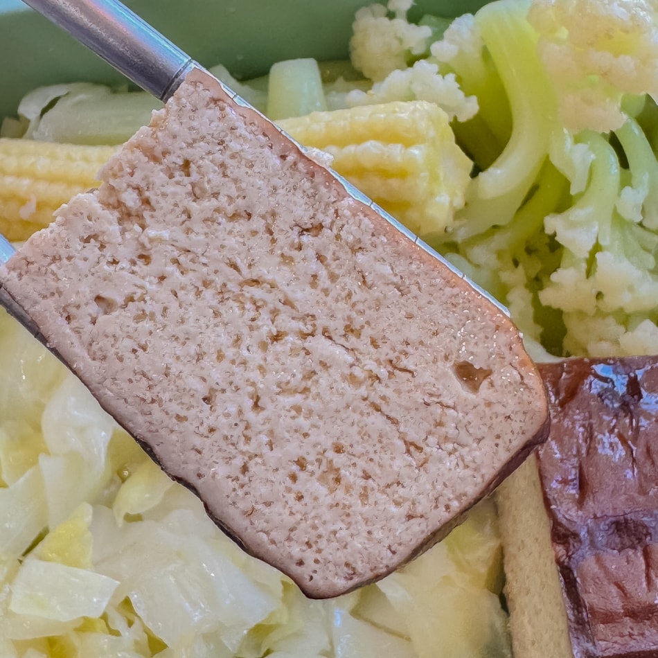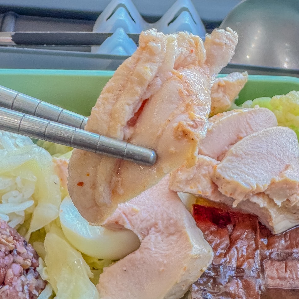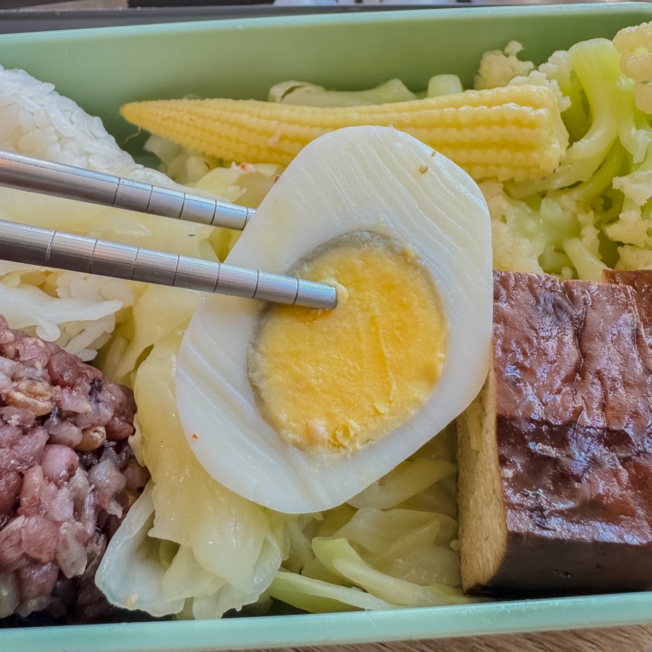 配菜則有爽脆的高麗菜、翠綠花椰菜、玉米筍,以及一塊入味的滷豆腐,還附上半顆滷蛋,營養均衡又有層次感。