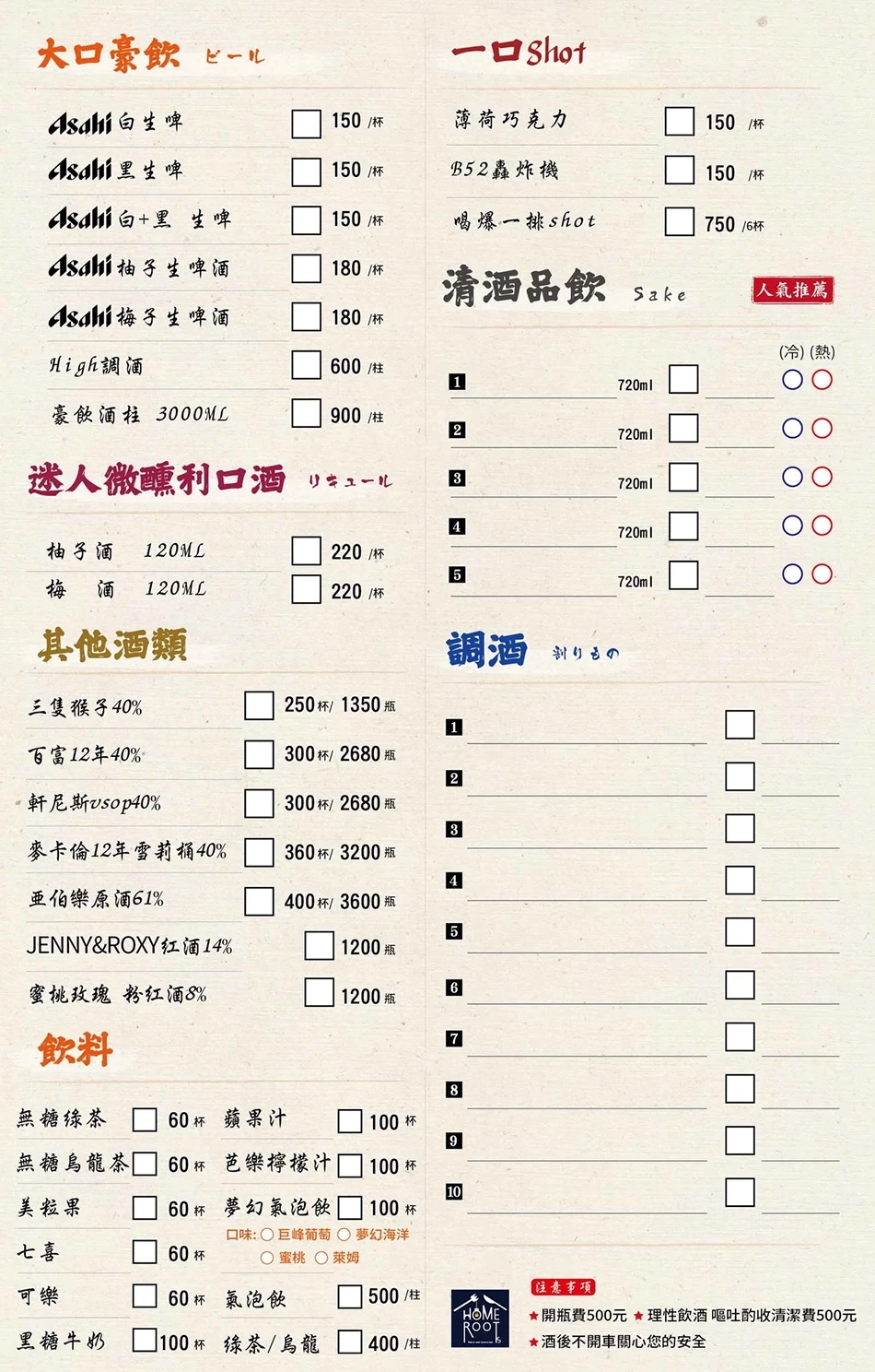 - 多樣化的飲品選擇:除了提供Asahi黑啤酒與黃金生啤酒外,家根創意酒肴還提供日本清酒、紅酒、威士忌、韓國燒酒等多種飲品,滿足不同喜好的顧客。