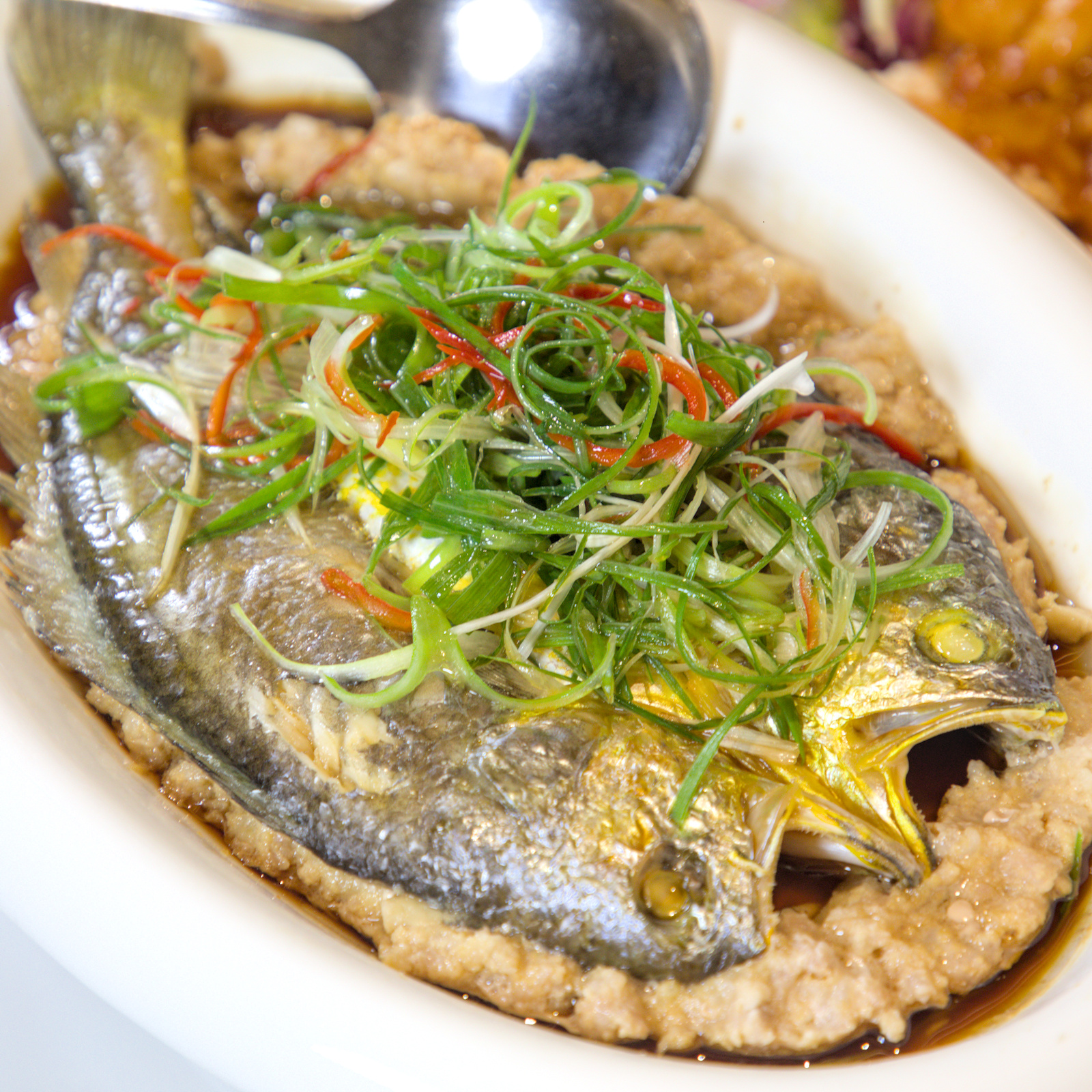 這是一道很考驗功夫的傳統粵菜。整條新鮮黃魚鋪在手打肉餅上清蒸,魚肉的鮮甜湯汁在蒸煮過程中完全滲透到底下的肉餅中。肉餅吸飽了海味精華,口感紮實彈牙,鹹香下飯,是長輩會非常喜歡的一道高雄美食。