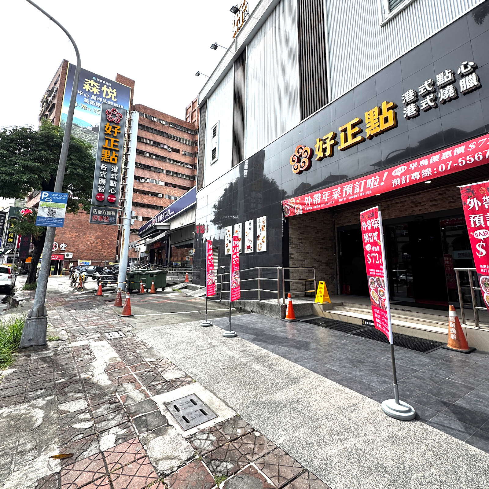 ▲好正點自由店位在高雄左營自由二路上,外觀以深色系搭配大面招牌,醒目又好找。店門口有無障礙坡道、紅色旗幟與海報,走過路過一定會注意到。
