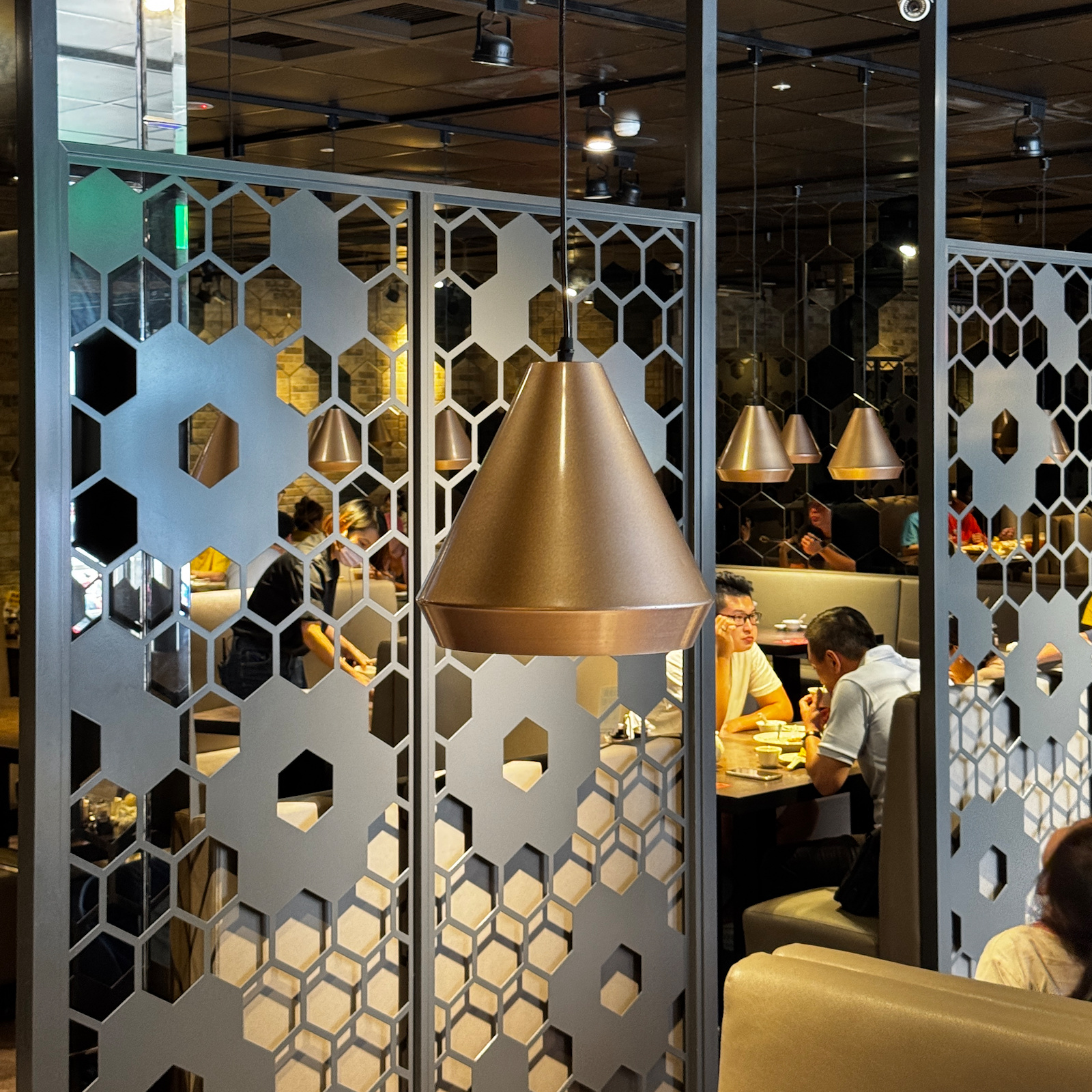 ▲▼店內空間寬敞,採用大量蜂巢狀鏡面、溫暖吊燈與舒適沙發卡座,呈現出現代感十足的「新派茶樓氛圍」。不僅舒適,也非常適合聚餐、家庭聚會與多人用餐,是高雄想吃港式點心時的好選擇。