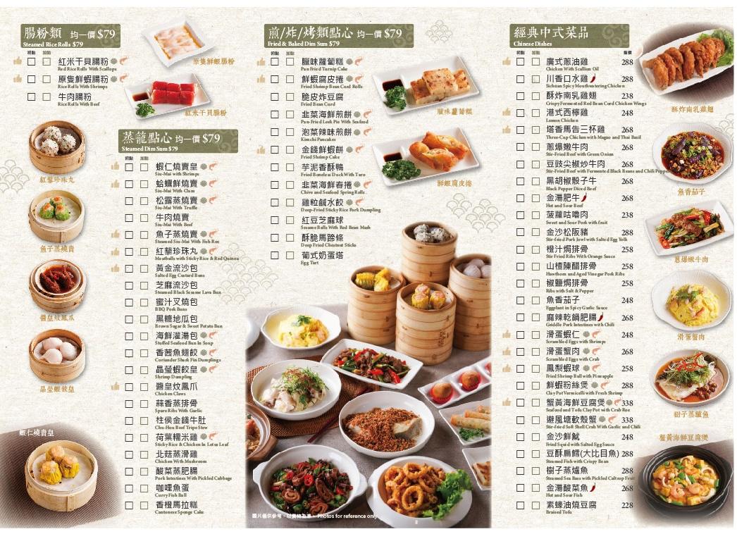 - 港式點心:腸粉、蒸籠點心、煎炸點心多數均一價 79 元,包含紅米干貝腸粉、原隻鮮蝦腸粉、蝦仁燒賣皇、晶瑩蝦餃皇、臘味蘿蔔糕、金錢鮮蝦餅等,適合多人分享。