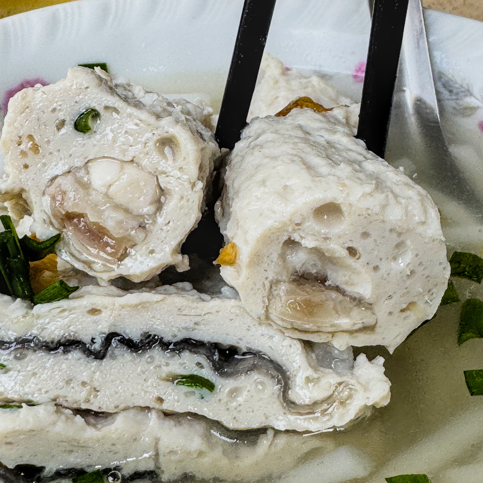 ▲這碗湯的基底,別於一般的細米粉,他們使用的是粗米粉(形狀類似米苔目,但米香更足,口感更滑順),Q彈滑溜,能充分吸飽湯汁,吃起來非常過癮。而精華就在這 三種魚丸 的豪華陣容: