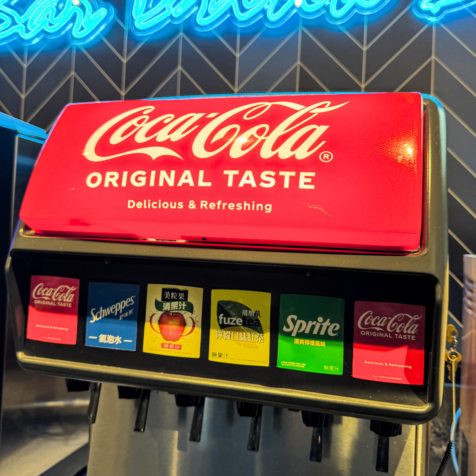 來瀧厚用餐,不只主餐有誠意,連自助吧也讓人驚喜。飲料機提供可樂、雪碧、蘋果汁、無糖檸檬紅茶等選項,不管是解渴還是搭牛排都很適合。