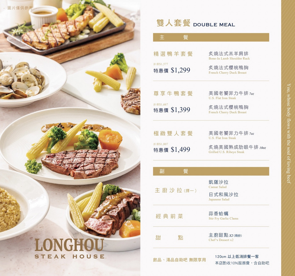 - 四款主餐:戰斧豬排、櫻桃鴨胸、羔羊肩排、菲力牛排