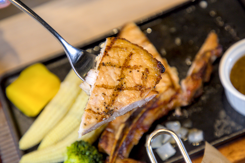 ▲▼外酥內嫩的戰斧豬排份量驚人,厚切排骨肉質鮮甜多汁,烙紋增添香氣。
