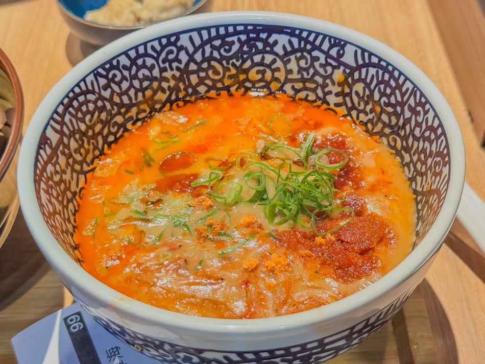 ▲▼濃厚海老沾麵的靈魂就在這碗熱呼呼的蝦味醬汁裡!橘紅色湯底以濃縮蝦頭熬煮,油香與海味融合得近乎完美,還帶點微辣刺激與蒜香尾韻,讓味蕾一瞬間被喚醒🔥。