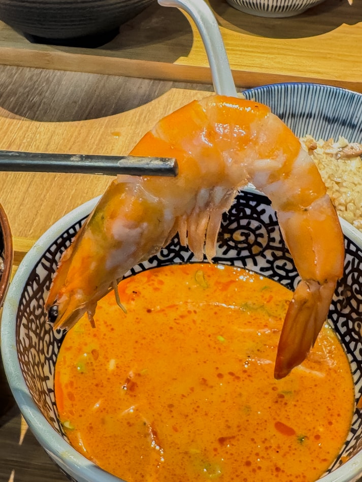 肉質緊實Q彈,輕咬就能感受到蝦肉的甜味與濃厚蝦油的鹹香在嘴中爆開。搭配底下那碗濃郁蝦湯,根本就是海味三連擊:喝湯、吃麵、咬蝦,三個步驟讓人完全投降。