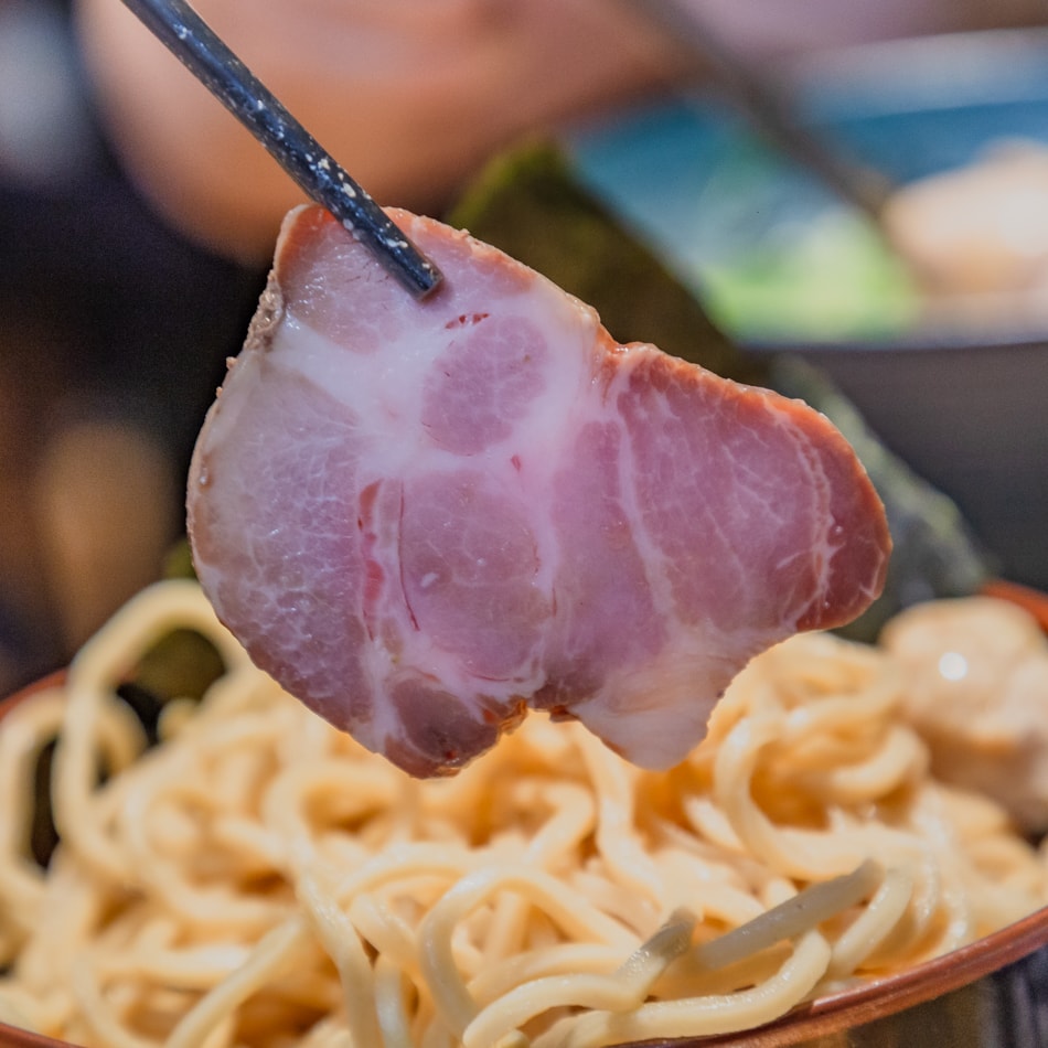 ▲使用豬肩胛部位製作,油脂與瘦肉分布均勻,表層略帶煙燻香氣。厚切不薄片,吃起來不會碎爛,反而帶有一點嚼勁。獨特的粉嫩色澤讓人一眼認出它的職人質感,是沾麵裡的靈魂之一。