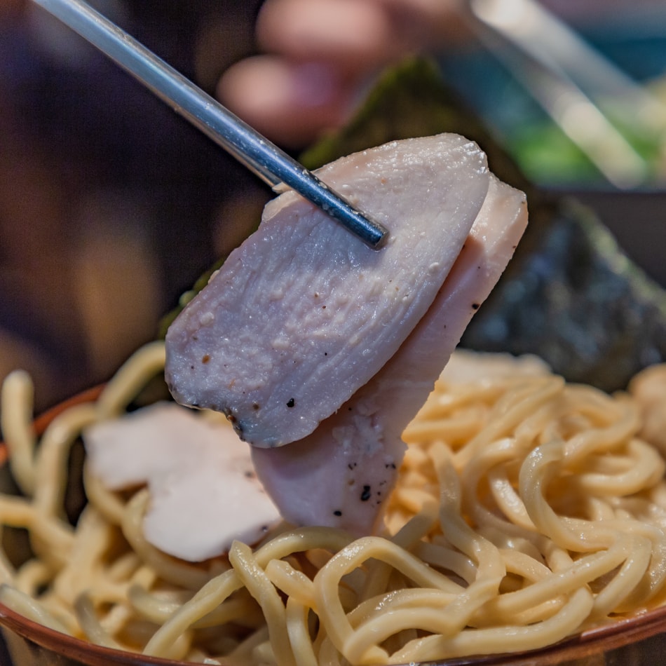 ▲選用雞胸部位,經低溫舒肥處理保留肉汁與柔嫩口感,切面細緻,口感不乾柴。輕灑黑胡椒調味,咀嚼中能感受到淡淡雞汁甜味,是一燈招牌沾麵中的清爽配角,讓整體味覺更有層次。