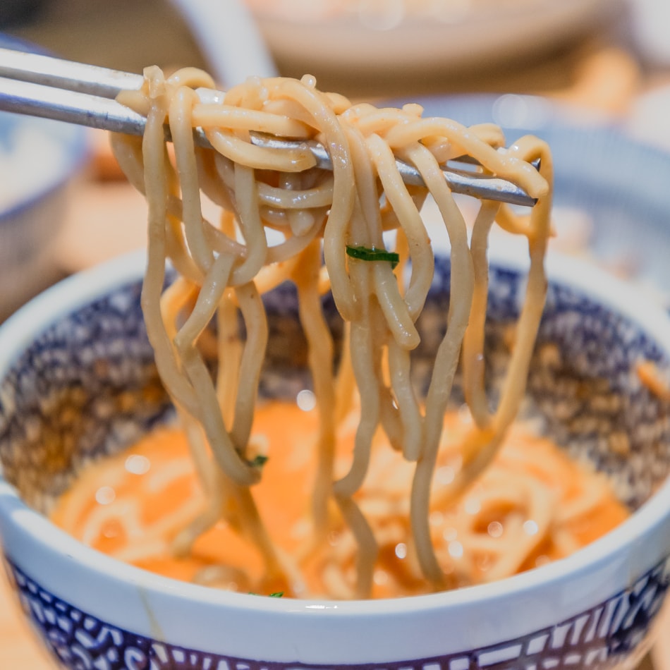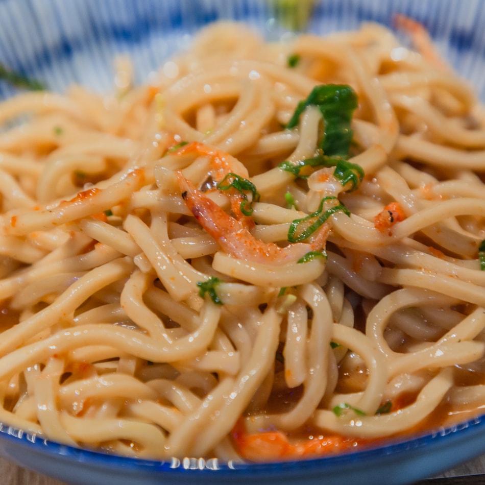 當Q彈的粗麵條一沾上這醬汁,表面立刻包覆濃稠醬液,入口滑順不膩,香氣爆發力極強,根本不用加配料就已經超有滿足感。一口麵、一口湯,彷彿在嘴裡完成一場蝦味交響曲,讓人忍不住默默點頭說出:「這碗有料!」