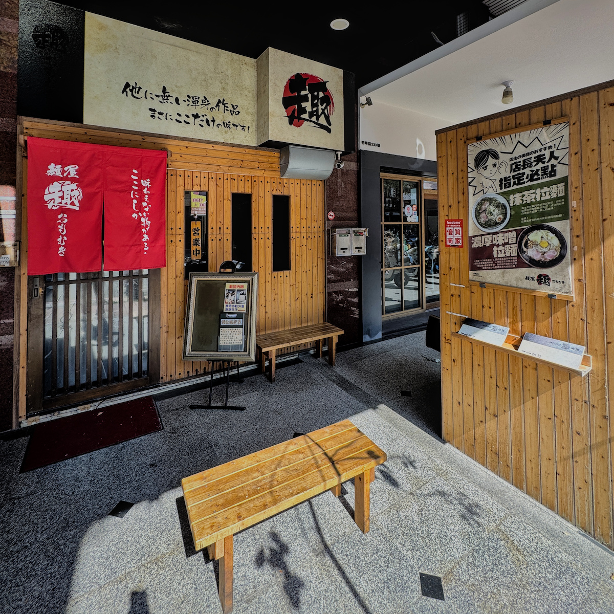 ▲▼麵屋趣位於鼓山區明華路上,鄰近熱鬧的巨蛋商圈。外觀呈現溫暖的日式木質調,店外的海報展示著店內主打。