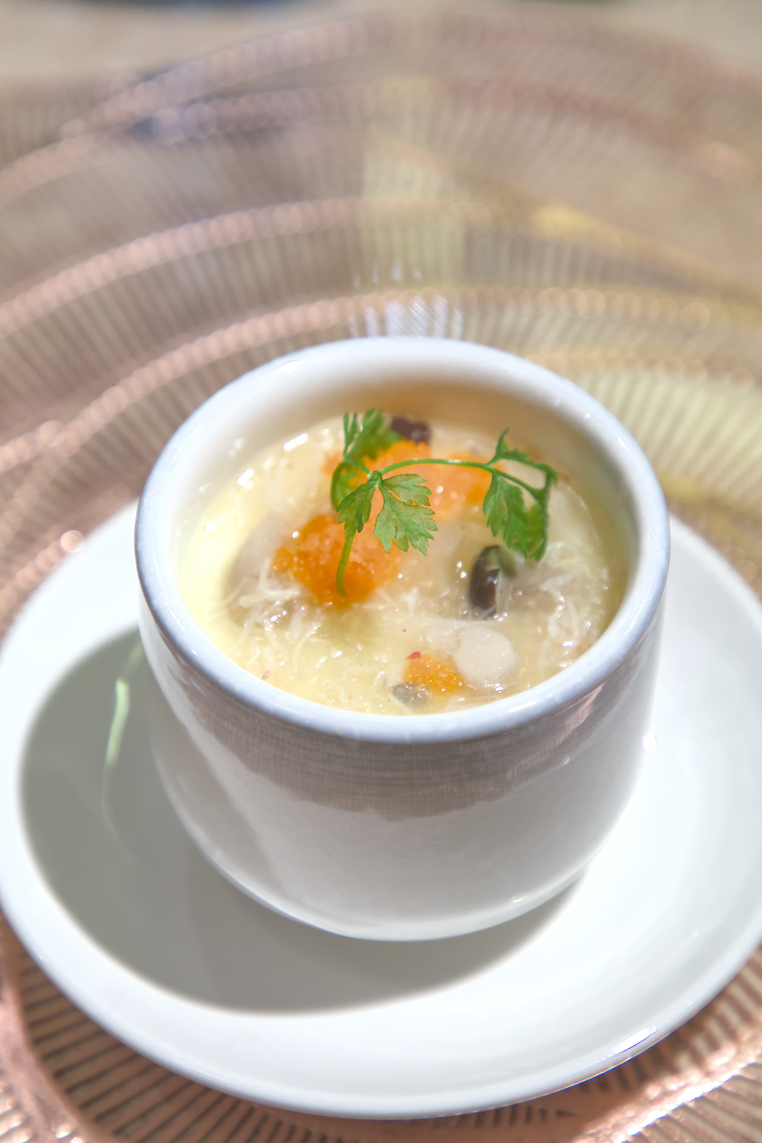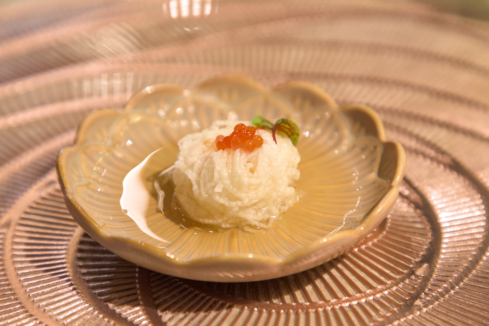 ▲▼主廚展現驚人的刀工,將日本山藥處理成細如絲縷的質地,入口後那種黏滑與清脆交織的口感非常迷人。上方點綴的鮭魚卵在口中輕輕爆開,瞬間釋放鹹甜的海味精華,是一道將清爽與奢華平衡得恰到好處的完美開場。