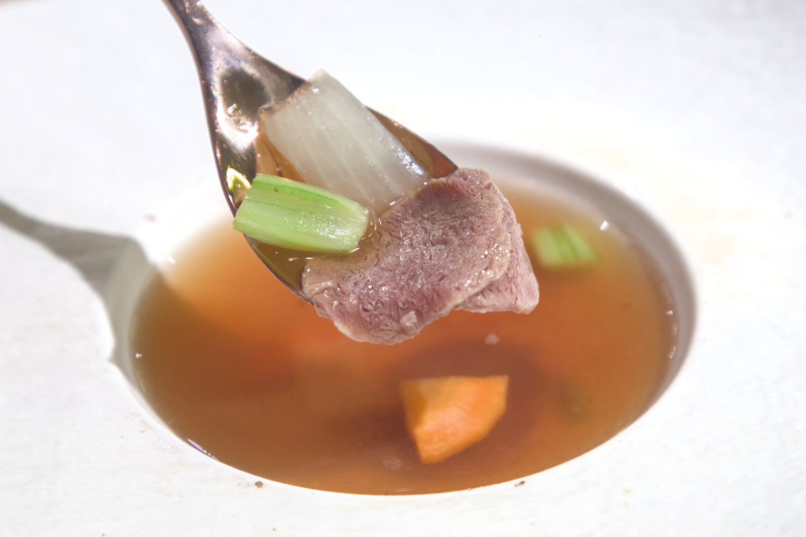 ▲▼這碗牛肉清湯充分體現了「原味創意」的精髓。湯底選用大量牛骨與蔬果經過長時間熬煮,過濾掉多餘雜質,呈現出晶瑩剔透的琥珀色。牛肉片鮮嫩無比,在熱湯沖下的瞬間熟成,帶出食材最純粹的鮮甜與溫潤,暖胃又暖心。