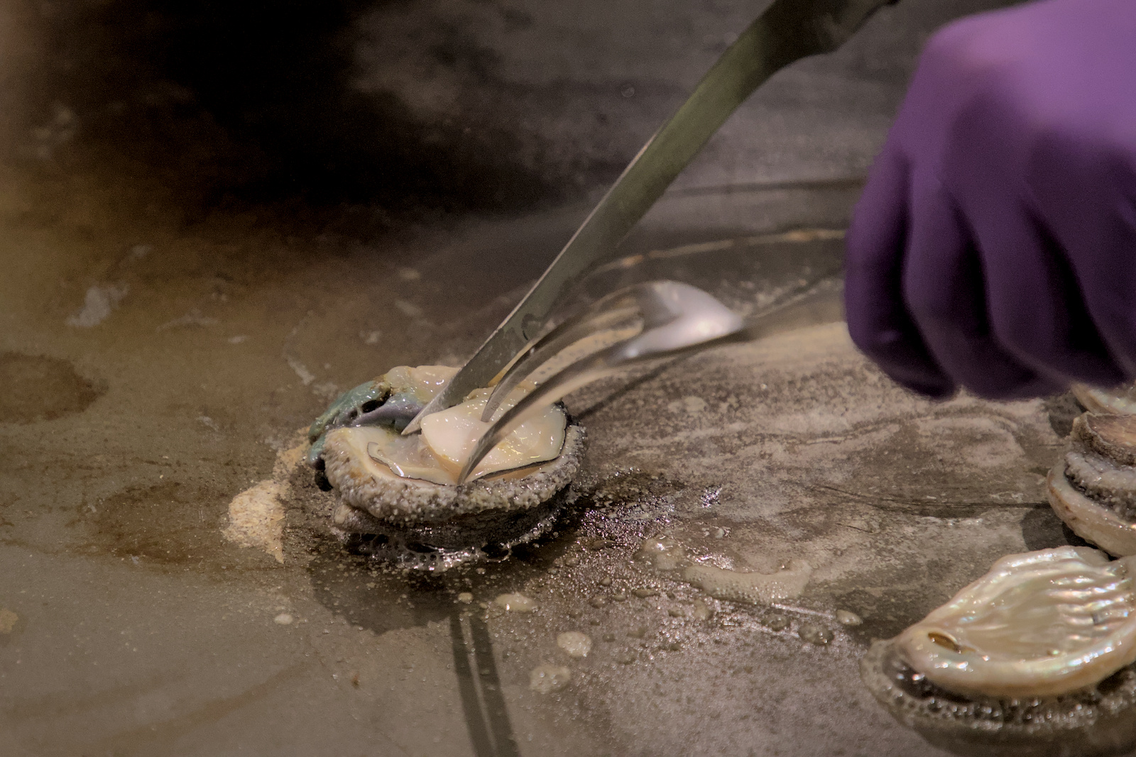 ▲▼這是整套料理的第一個高潮!看著體型碩大、鮮活十足的南非鮑魚在鐵板上因受熱而舞動,正是「尚青」的最好證明。師傅精準掌控火侯與時間,確保鮑魚熟度剛好,入口後肉質極其 Q 彈厚實,帶著一股強勁的張力與海洋原始的甜度,完全沒有一般冷凍鮑魚的乾柴感,令人回味無窮。