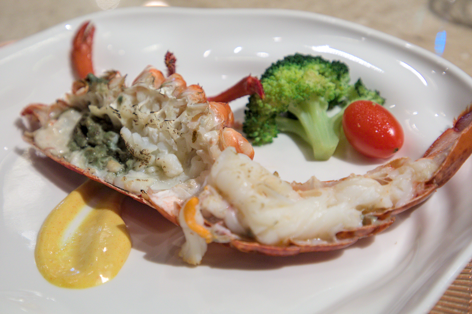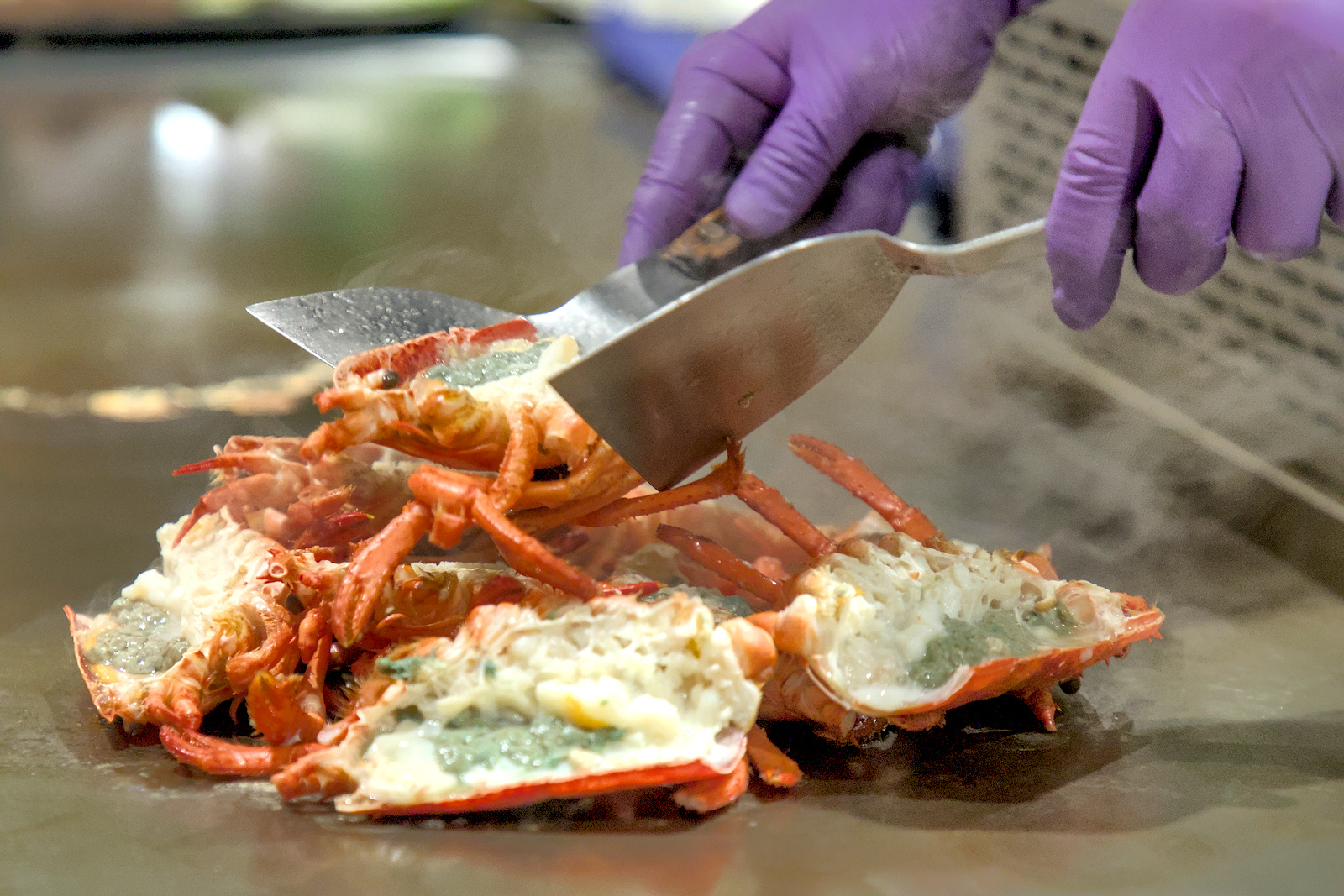 ▲▼重頭戲登場!選用當季最肥美的活龍蝦,每位賓客都能享用足足半尾。主廚巧妙運用龍蝦不同部位的特性,推出「雙吃」做法:蝦身以大火鐵板香煎,肉質緊實且富有彈力,海味濃縮在每一絲肌肉中;蝦螯則細心挑出後另行料理,口感更加鮮嫩滑潤。這不僅是視覺上的奢華演出,更是對頂級食材深層次風味的深度挖掘。
