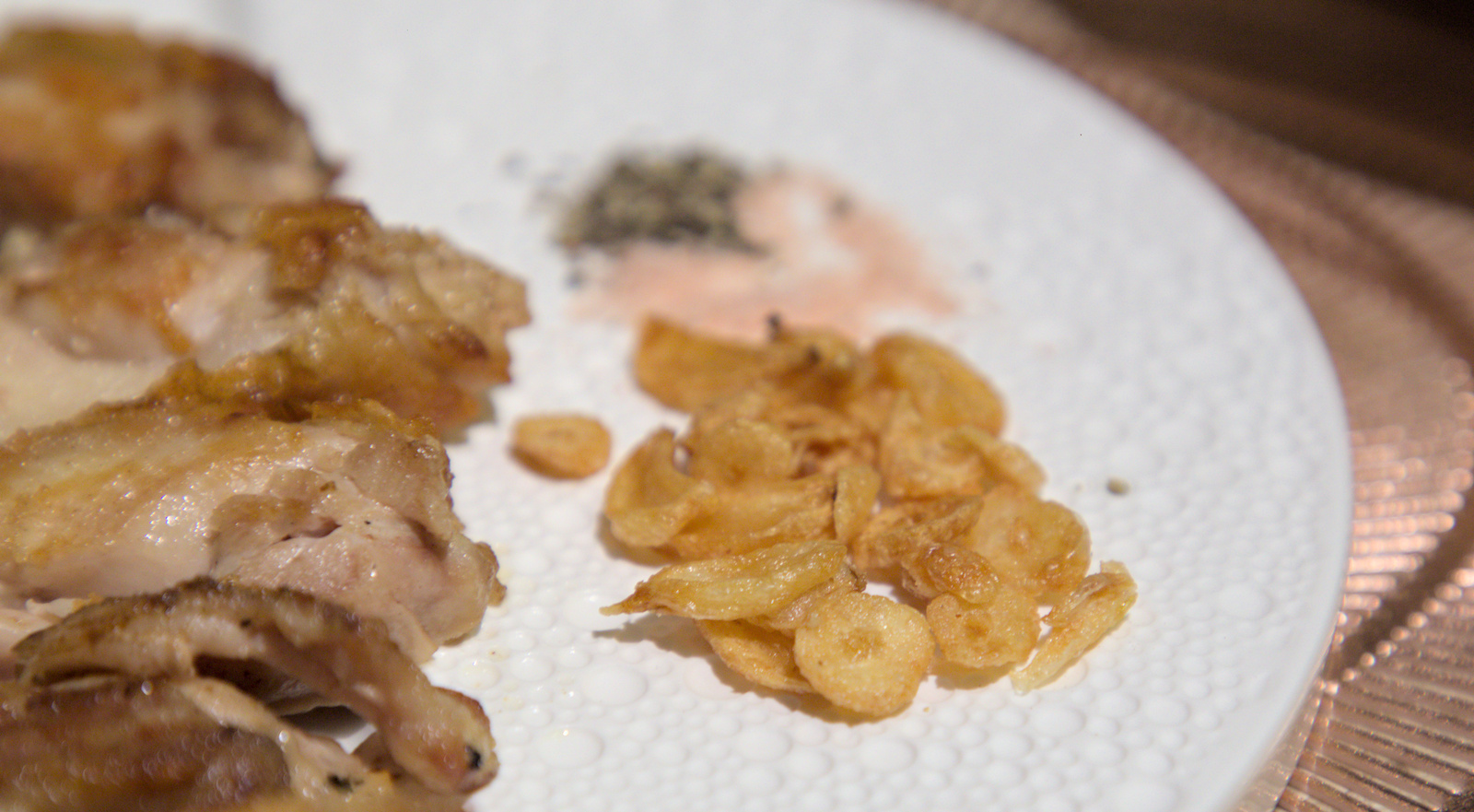 ▲▼賓客可依喜好選擇紐西蘭菲力牛排或西班牙伊比利豬。菲力牛排油脂含量低但質地極其細嫩,主廚建議的三至五分熟度能完美展現其甜度與肉汁。而伊比利豬則帶著特殊的堅果香氣,煎至全熟依然保持著豐富的彈性與滑潤度。搭配師傅自製的香脆蒜片與海鹽,簡單卻能將肉品檔次推升至極限。
