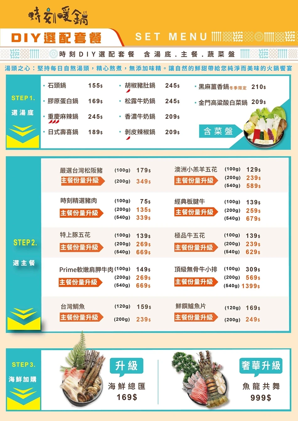 - DIY選配套餐菜單,您可以自由搭配湯底和主餐。