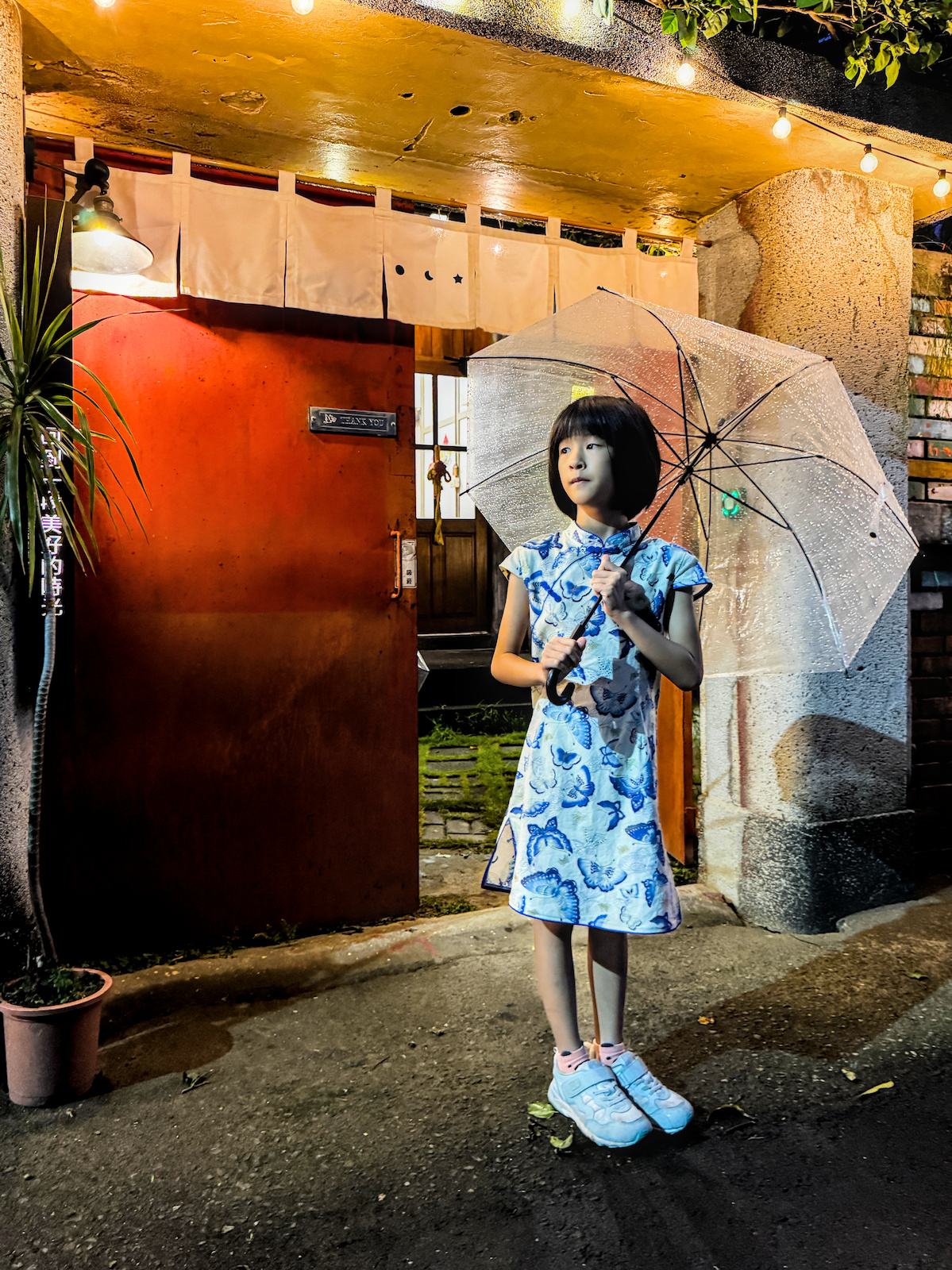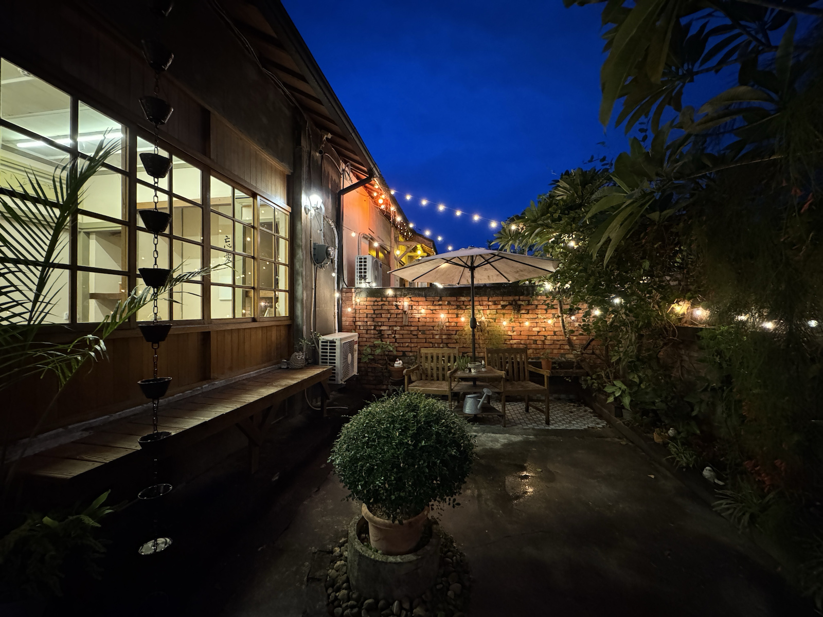 ▲夜幕降臨後的庭院,串燈與紅磚牆交織出迷人的眷村夜景。