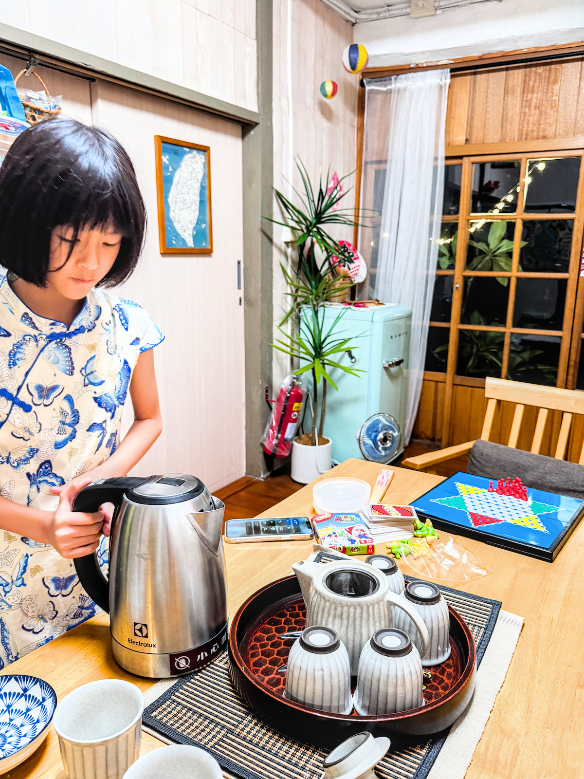 ▲孩子也能一起參與泡茶儀式,讓旅行多了專屬家的記憶。