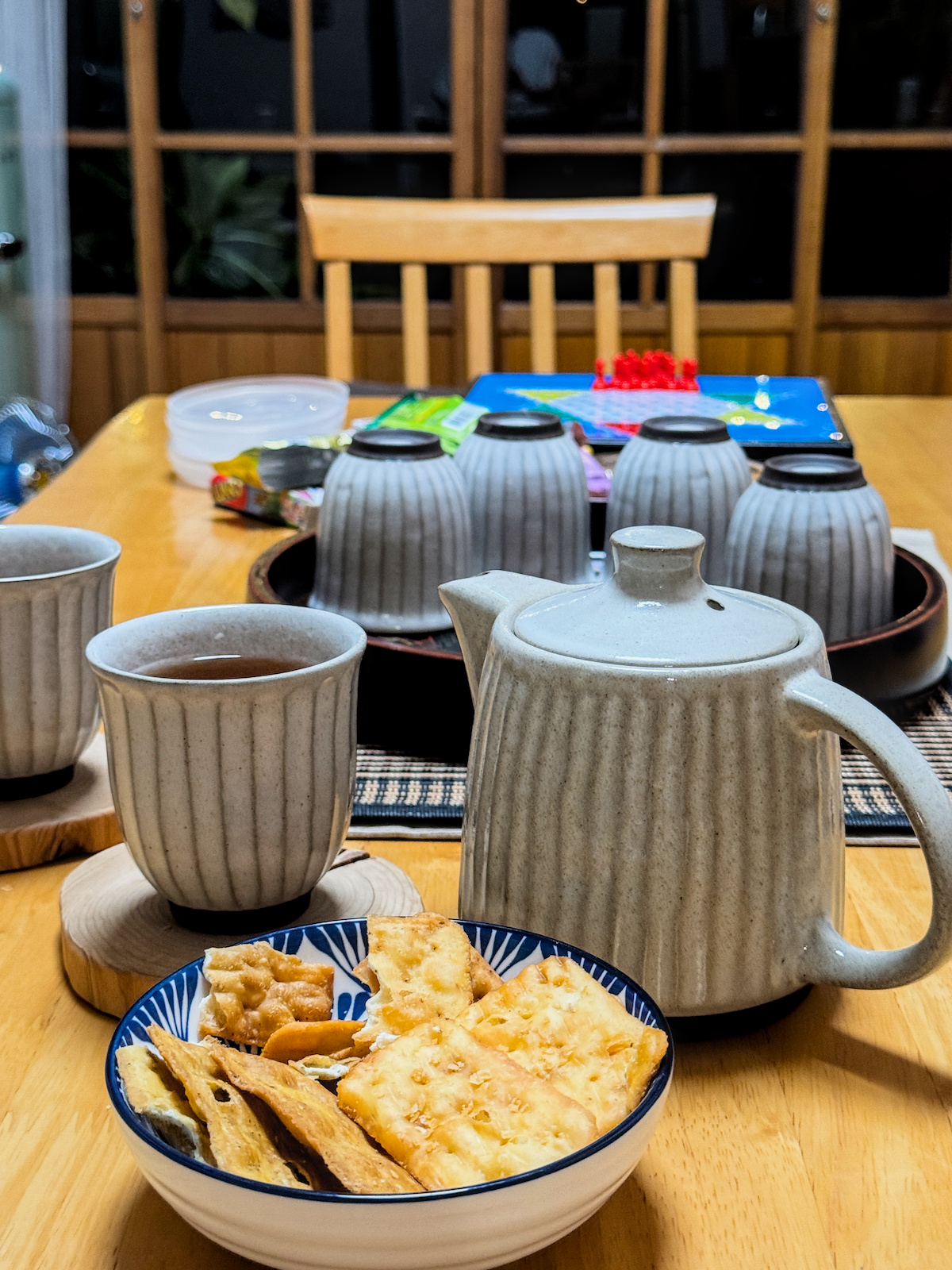 ▲夜深了,在木桌前喝茶、吃點心、聊天,是最日常也最幸福的片刻。