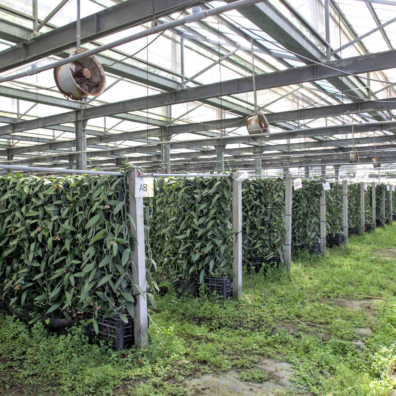 ▲溫室內整齊排列的香莢蘭牆,是培育出世界級香草莢的秘密基地。