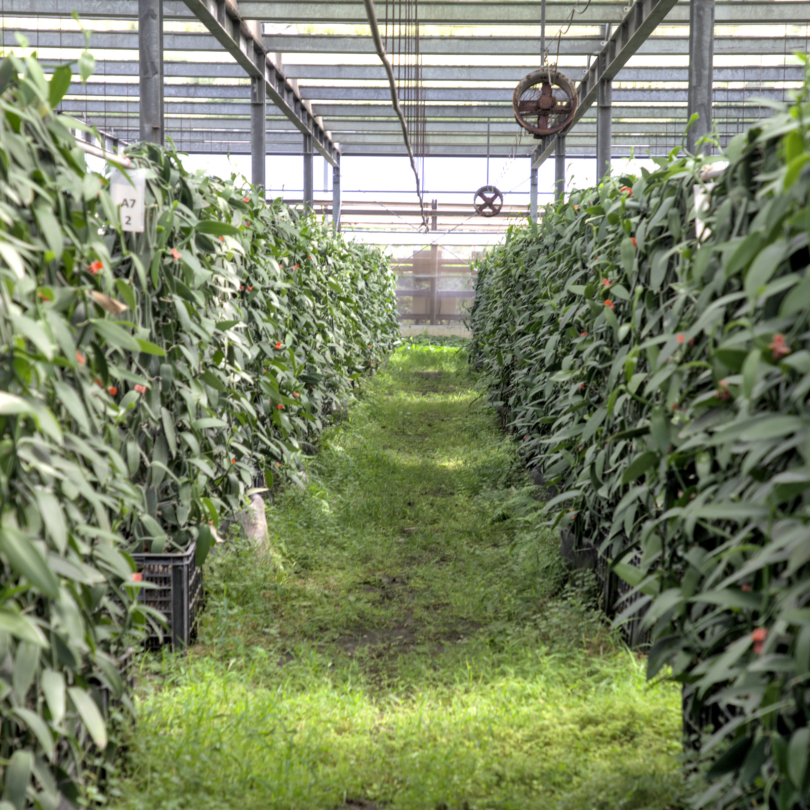 踏入向陽的溫室,立刻被眼前的景象震撼。一整片綠色藤蔓牆整齊地排列,這裡是「香莢蘭」生長的地方。但這裡與眾不同的是,它是「全世界第一場在光電板下種出好品質香草莢的農場」。