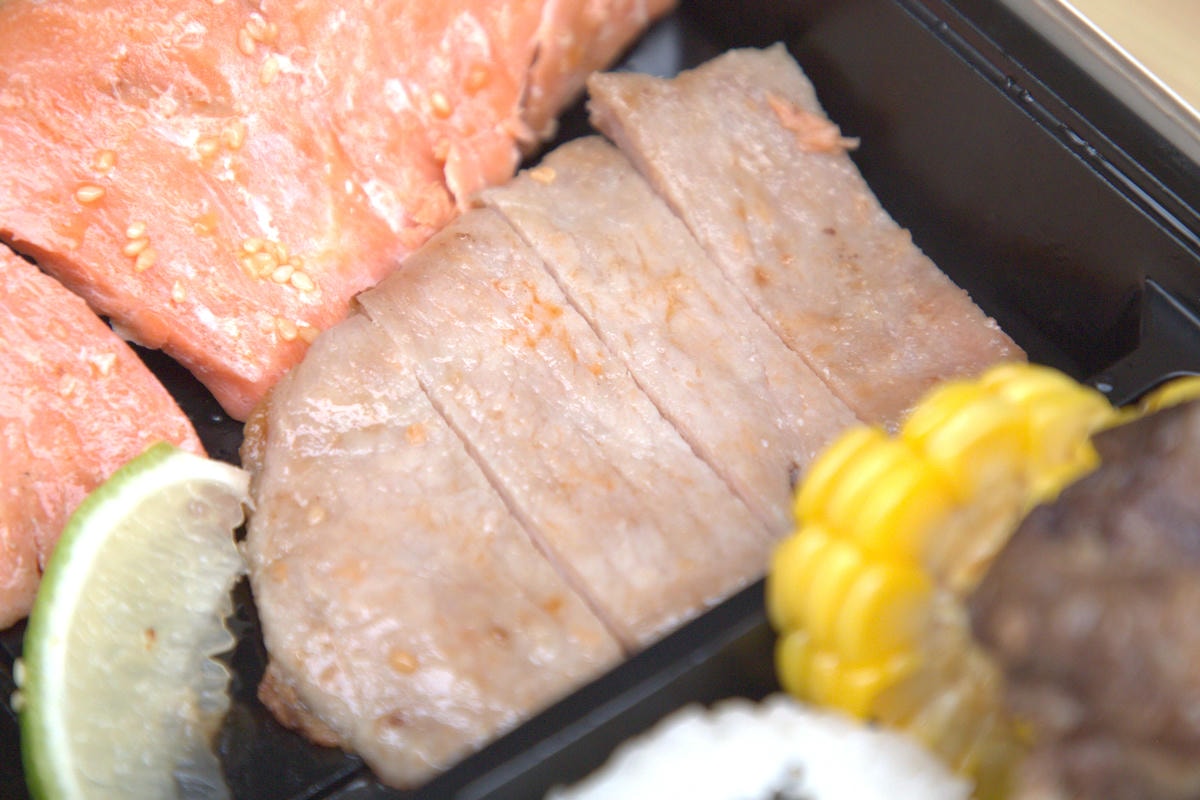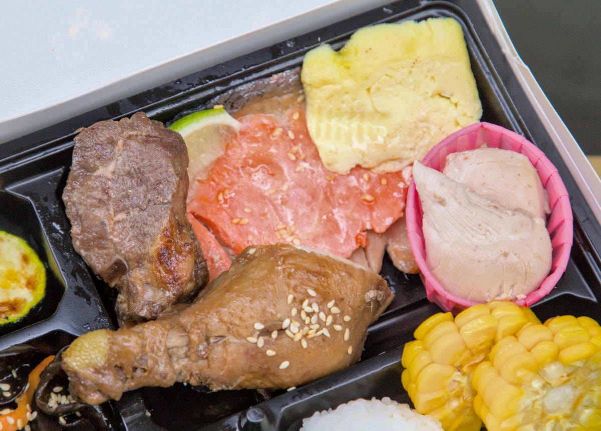 ▲主菜包含 鮭魚(生魚片等級)、羊排、滷雞腿、鹽烤豬排、日式嫩雞。嫩雞特別使用台灣雞柳條,口感細嫩勝過舒肥雞。