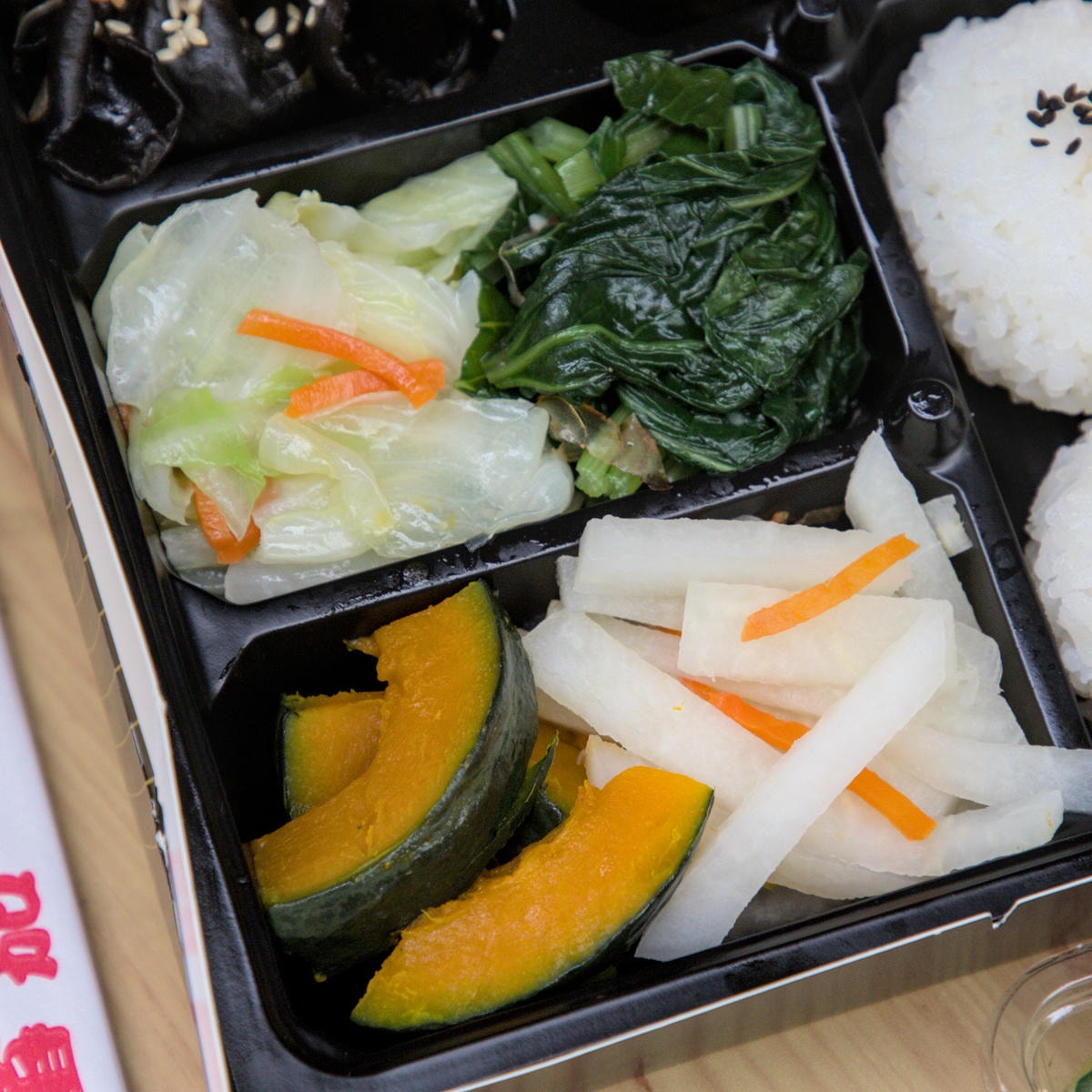 ▲這款小資便當雖然價格實惠,但在主菜和配菜的搭配上卻一點都不馬虎,每一樣都充滿了巧思與美味。內含 雞、豬、魚、蝦六種主菜,有日式雞柳條(原肉製成、不裹粉)、琵琶蝦(象徵長壽)、鱈魚排、松子捲(松子與豬肉製成),還有剛才有介紹過的日式燒肉與薄鹽鯖魚。