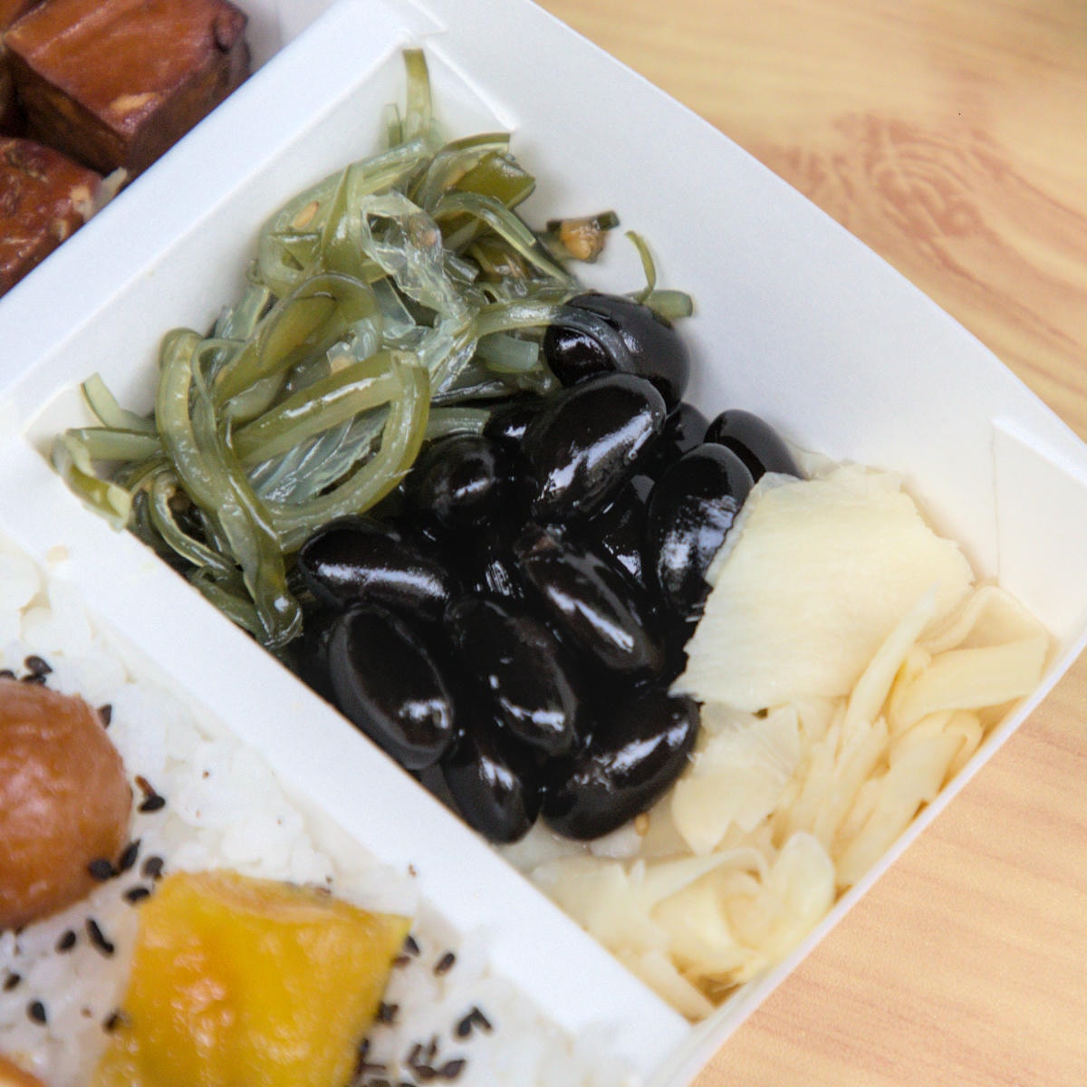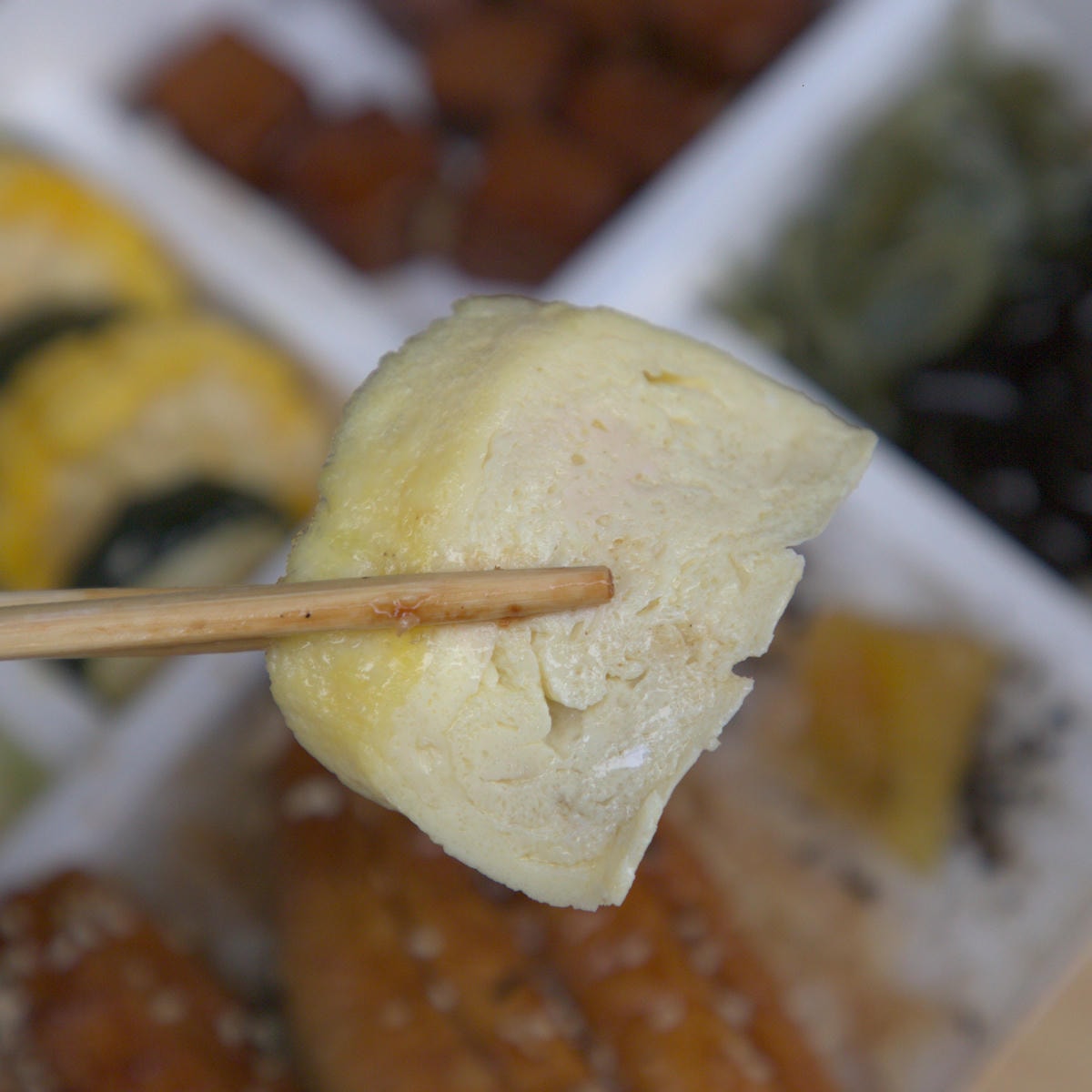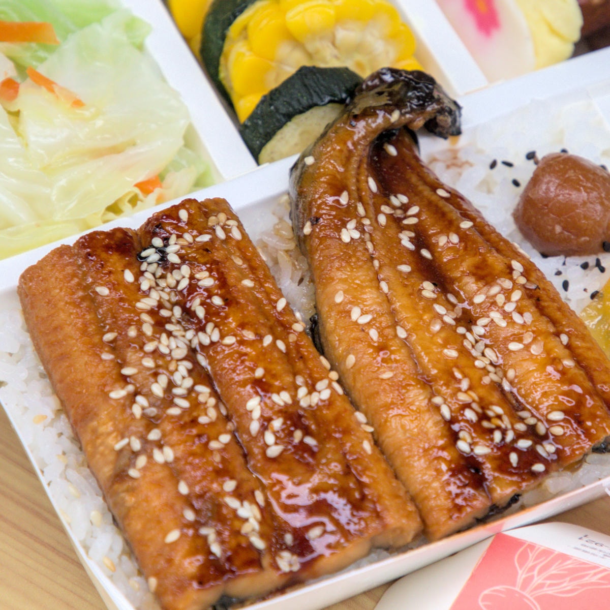 ▲便當裡最吸睛的莫過於兩大片蒲燒鰻魚。店家使用的鰻魚特別講究,是專吃鮮魚、不吃飼料的頂級鰻魚。經過日式蒲燒醬汁的烘烤,鰻魚肉質Q彈緊實,毫無腥味。不過,由於是天然鰻魚,可能會有一些細小的刺,食用時請多加留意,細心品嚐這份來自海洋的極致美味。