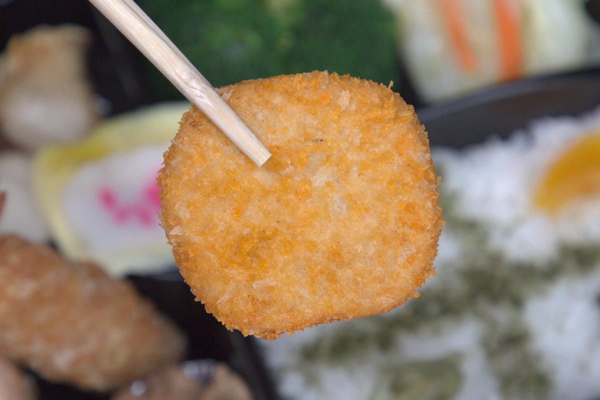 ▲琵琶蝦:象徵長壽的炸海老,這隻金黃酥脆的炸蝦,在日文裡稱作「海老」,帶有長壽的美好寓意。店家特別選用琵琶蝦,外型飽滿,裹上薄脆的麵衣後酥炸,蝦肉Q彈緊實,口感和風味都非常棒,為便當增添了一份海陸風味。