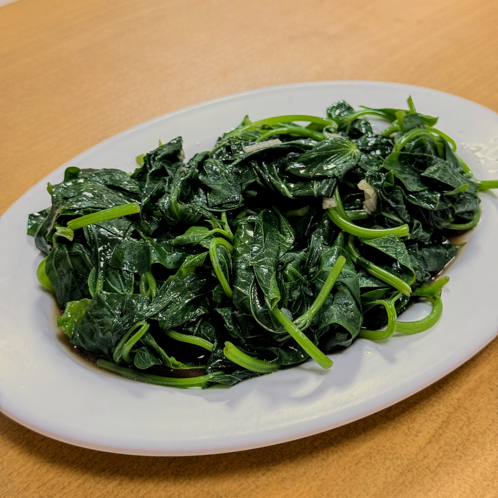 ▲當您享用完濃郁的乾麵後,來一份清爽的燙青菜是最棒的平衡。這裡的地瓜葉份量實在,葉片翠綠鮮嫩,簡單清燙後淋上少許油蔥和醬汁。口感清脆,保留了蔬菜本身的甜味,是解膩又營養的絕佳配角。