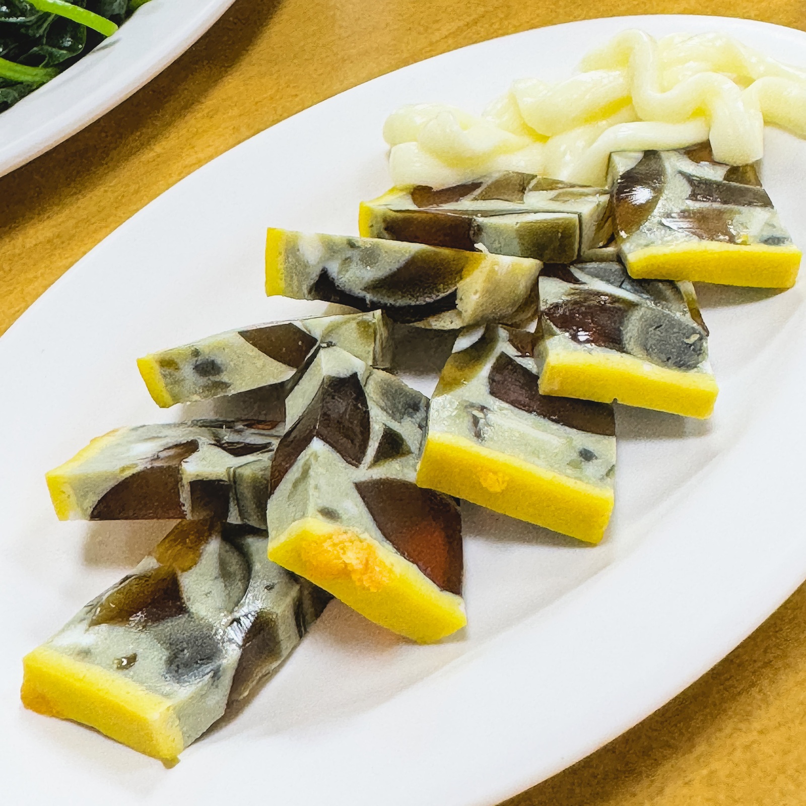 ▲三色蛋是台灣傳統宴席上常見的冷盤小菜,在小麵店中看到它也代表了店家對小菜的用心。它由皮蛋、鹹蛋黃和雞蛋三種蛋類混合蒸製而成,切成漂亮的菱形塊狀