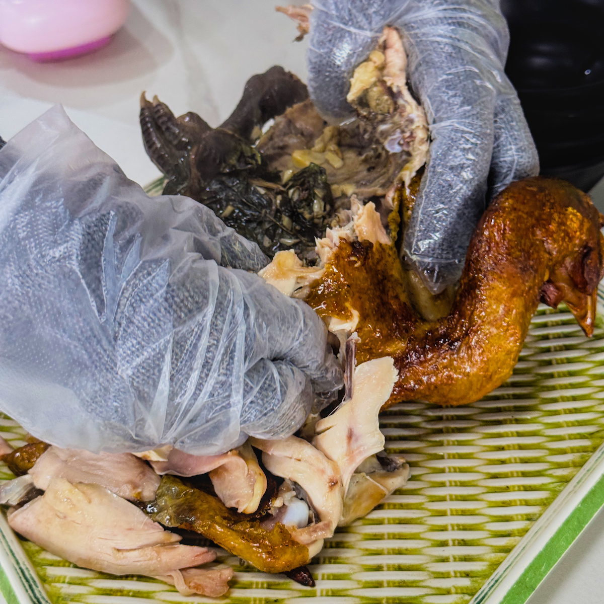 ▲雞腹內填充的九層塔與大量蒜末在旋轉過程中,精華被果凍般的雞汁緊緊鎖在肉裡。剝開雞肉時,濃郁的辛香料與炭香味瞬間噴發。