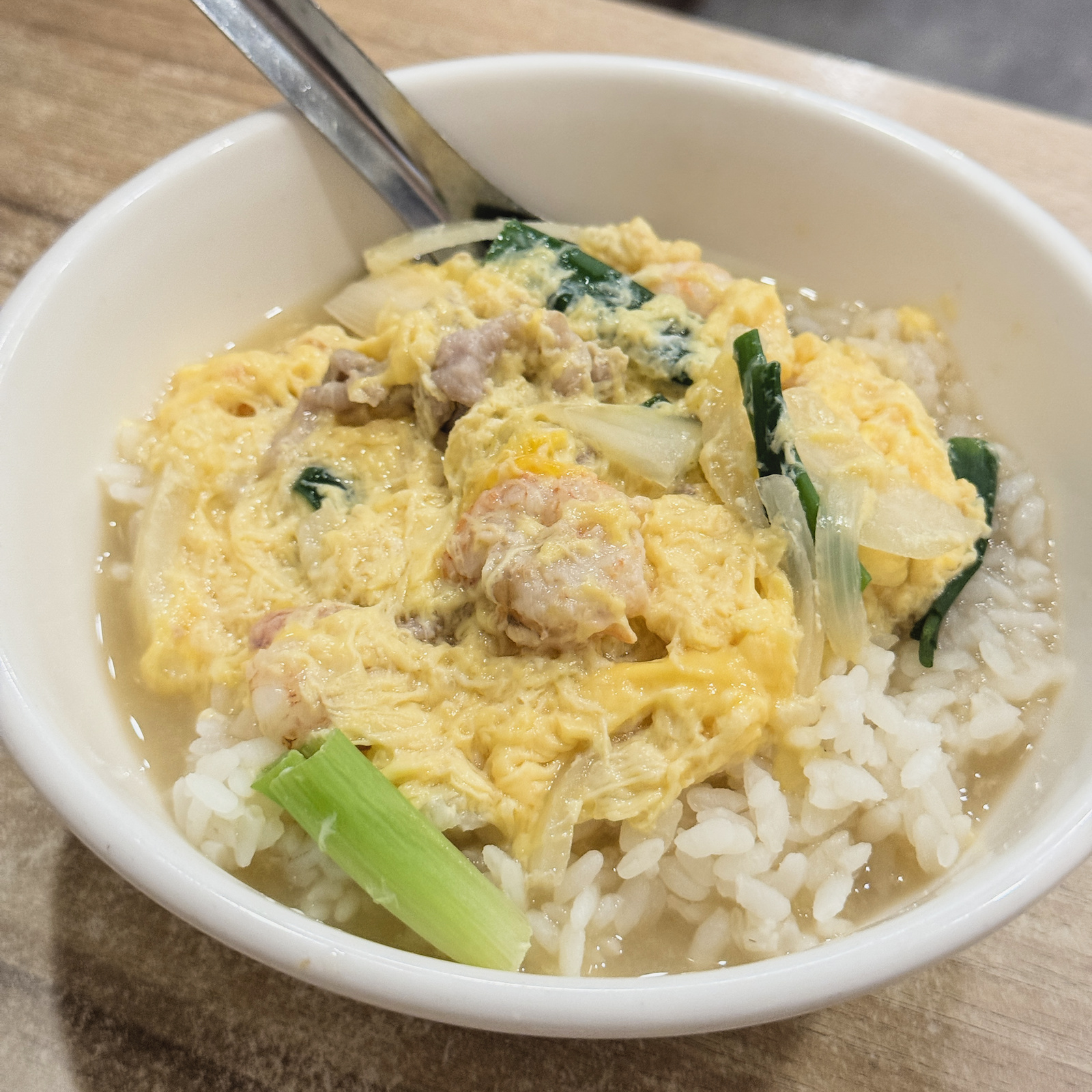 ▲矮仔成的綜合丼並非傳統日式風味,它是在蝦仁飯的基礎上,鋪上滑嫩的半熟蛋,並且加入蝦仁和肉片。熱騰騰的飯體浸潤了金黃的蛋液與湯汁,口感更加溫潤順口。對於喜歡蛋香和濕潤米飯的人來說,這款親子丼是極佳的選擇,蛋香、肉香、蝦香三重交織,一口下去超滿足!